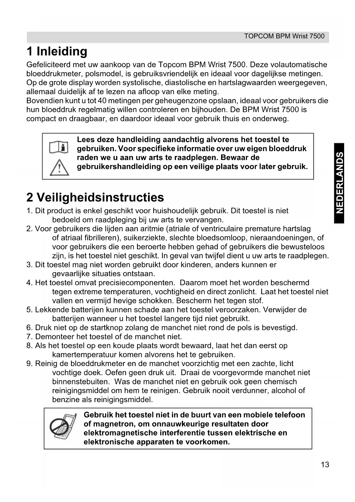Damage or defects caused by incorrect treatment or operation and damage resulting from use of non-original parts or accessories are not covered by the warranty. The warranty does not cover damage caused by outside factors, such as lightning, water and fire, nor any damage caused during transportation. No warranty can be claimed if the serial number on the units has been changed, removed or rendered illegible. Any warranty claims will be invalid if the unit has been repaired, altered or modified by the buyer.13 TOPCOM BPM Wrist 7500 NEDERLANDS 1 Inleiding Gefeliciteerd met uw aankoop van de Topcom BPM Wrist 7500. Deze volautomatische bloeddrukmeter, polsmodel, is gebruiksvriendelijk en ideaal voor dagelijkse metingen. Op de grote display worden systolische, diastolische en hartslagwaarden weergegeven, allemaal duidelijk af te lezen na afloop van elke meting. Bovendien kunt u tot 40 metingen per geheugenzone opslaan, ideaal voor gebruikers die hun bloeddruk regelmatig willen controleren en bijhouden. De BPM Wrist 7500 is compact en draagbaar, en daardoor ideaal voor gebruik thuis en onderweg. 2 Veiligheidsinstructies