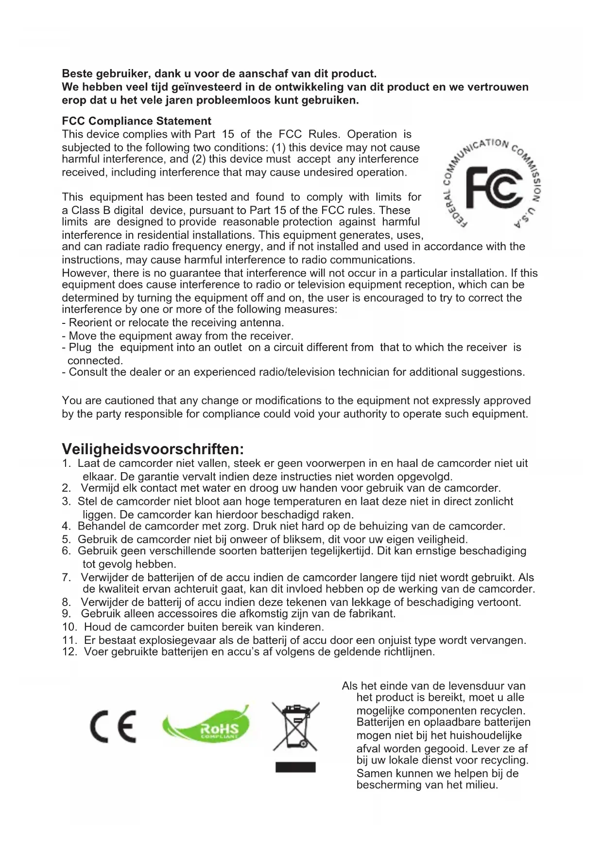 - 15 Problemen oplossen Als u de camcorder gebruikt: Probleem Oorzaak Oplossing De camcorder kan niet nor- maal worden ingeschakeld. De batterij is leeg. Vervang de batterij. De batterij is niet correct geplaatst. Plaats de batterij opnieuw. Ik kan geen foto’s of video- opnamen maken wanneer ik op de Ontspanknop of Opnameknop druk. Onvoldoende geheugen. Maak wat ruimte vrij op de SD/MMC-kaart of op het interne geheugen. De camcorder is bezig met het opladen van de itser. Wacht tot de itser volledig is geladen. U gebruikt een ‘beveiligde’ SD-kaart. Stel de SD-kaart in op schri- jfbaar. Het LCD-scherm geeft het bericht ‘GEHEUGENFOUT’ of ‘KAARTFOUT’ weer, of de camcorder kan de geheugen- kaart niet lezen. Het formaat van de geheu- genkaart is niet compatibel met de camcorder. Gebruik de camcorderfunctie ‘Formatteren’ om de kaart te formatteren. De geheugenkaart is beschadigd. Vervang de geheugenkaart door een nieuwe. Ik heb geen foto’s of video- opnamen verwijderd, maar ik kan ze niet vinden op de geheugenkaart. De verloren opnamen zijn opgeslagen in het intern geheugen. Dit gebeurt wanneer u een geheugenkaart plaatst nadat u enkele foto’s of video-opnamen hebt gemaakt. U krijgt toegang tot deze bestanden nadat u de geheugenkaart hebt verwijderd. Ik kan de itser niet gebruiken Als het batterijpictogram een laag vermogen aan- geeft, kan de itser worden uitgeschakeld vanwege een te lage spanning. Vervang de batterij. Tijdens het gebruik reageert de camcorder niet op een actie. Er is een softwarefout op- getreden in de camcorder. Verwijder de batterijen en ver- vang deze. Schakel vervolgens de camcorder in.16 Als u de camcorder gebruikt: Probleem Oorzaak Oplossing De opgenomen beelden zijn te wazig. De scherpstelling is niet correct ingesteld. Stel de scherpstelling in op een geschikte stand. De foto’s of video-opnamen zijn te donker. De opnameomgeving is onvoldoende verlicht. Gebruik de itser wanneer u foto’s maakt. Voeg extra lichtbronnen toe wanneer u video-opnamen maakt. Wanneer ik opnamen bekijk op het LCD-scherm of op de computer, is er ruis zichtbaar. De beeldverversing komt niet overeen met de stan- daard van het land waar u verblijft. Pas de beeldverversing aan. Raadpleeg de tabel ‘Beeldver- versing’ voor meer informatie. Ik wil de volgnummering van de bestandsnamen (IMG_xxxx) opnieuw laten beginnen. De nummering wordt uit- gevoerd door de rmware van de camcorder. Gebruik de camcorderfunctie ‘Formatteren’ om de kaart te formatteren. Ik converteer een mediabes- tand en geef het de naam IMGxxxx.* (xxxx geeft het nummer aan). Daarna kopieer ik het bestand naar de camcorder, maar ik kan het niet meer terugvinden op de camcorder. Er is een ander bestand met hetzelfde volgnum- mer (bijv. IMG0001.MP4 en IMG0001.JPG), of het bestandstype wordt niet ondersteund. Geef het bestand een ander volgnummer en controleer of het bestandstype door de cam- corder wordt ondersteund.17 Als u de camcorder aansluit op de computer of op de tv: Probleem Oorzaak Oplossing Ik kan de video-opnamen niet op mijn computer bekijken. Het stuurprogramma of de software is niet op de computer geïnstalleerd. Installeer Direct X 9.0c of hoger en Windows Media 9.0 Codecs om dit probleem op te lossen. Installeer de software en het stu- urprogramma van de bijgeleverde cd, of ga naar http://www.microsoft. com om de vereiste bestanden te downloaden. Raadpleeg ‘Bestanden kopiëren naar uw pc’. Installatie stuurprogram- ma mislukt. De installatie is niet correct beëindigd. Verwijder het stuurprogramma en andere verwante programma’s. Volg de installatiestappen in de handleiding om het stuurprogramma opnieuw te installeren. De camcorder werd met de USB-kabel aangesloten op de pc voordat u het stuurprogramma hebt geïnstalleerd. Installeer het stuurprogramma voor- dat u de USB-kabel aansluit. Het tv-scherm verschijnt niet nadat ik de cam- corder op de tv heb aangesloten. De camcorder is niet cor- rect aangesloten op de tv. Sluit de camcorder opnieuw op cor- recte wijze aan op de tv. Er is een conict opget- reden met een andere geïnstalleerde camcorder of een ander opnameap- paraat. Het apparaat is niet com- patibel met de camcorder. Als er al een andere camcorder of een ander opnameapparaat op uw computer is geïnstalleerd, verwijder dan de camcorder en zijn stuurpro- gramma volledig van de computer om het conict te vermijden. Er is ruis zichtbaar op mijn computerscherm wanneer ik Videoconfer- entie gebruik. De beeldverversing komt niet overeen met de stan- daard van het land waar u verblijft. Pas de beeldverversing aan. Raad- pleeg de tabel ‘Beeldverversing’ voor meer informatie. De inhoud van deze handleiding kan zonder voorafgaande melding worden gewijzigd.Filmadora de Alta Definição Manual do UtilizadorQuando desejar desfazer-se do produto, por favor recicle todos os componentes possíveis. As baterias e pilhas recar- regáveis não devem ser colocadas juntamente com o lixo doméstico! Por favor recicle-as num ponto de recolha de reciclagem. Juntos, podemos ajudar a proteger o ambiente. Bem-vindo Estamos honrados com a escolha do nosso produto. Antes de usar, por favor, leia as seguintes observações cuidadosamente. FCC Compliance Statement This device complies with Part 15 of the FCC Rules. Operation is subjected to the following two conditions: (1) this device may not cause harmful interference, and (2) this device must accept any interference received, including interference that may cause undesired operation. This equipment has been tested and found to comply with limits for a Class B digital device, pursuant to Part 15 of the FCC rules. These limits are designed to provide reasonable protection against harmful interference in residential installations. This equipment generates, uses, and can radiate radio frequency energy, and if not installed and used in accordance with the instructions, may cause harmful interference to radio communications. However, there is no guarantee 