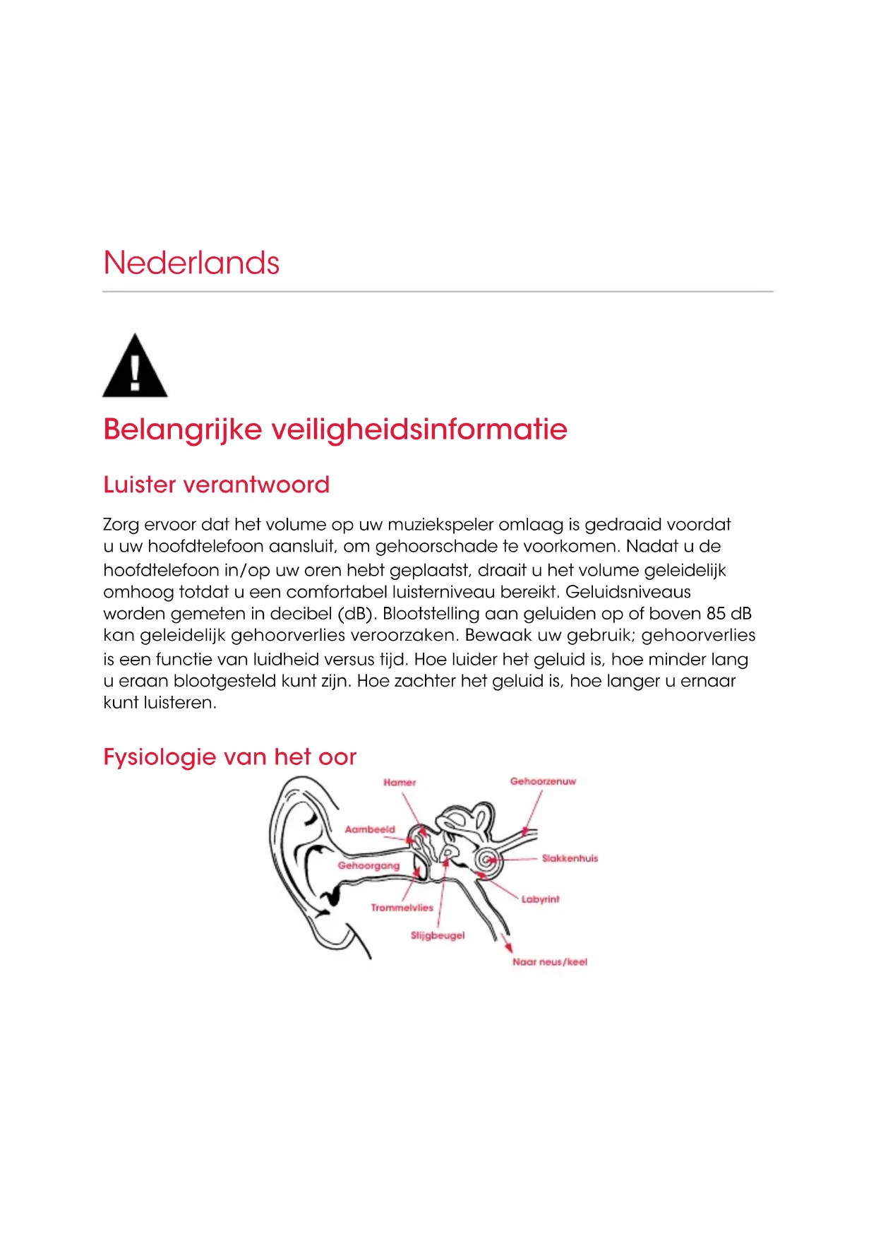 Nein DeutschBelangrijke veiligheidsinformatie Luister verantwoord Zorg ervoor dat het volume op uw muziekspeler omlaag is gedraaid voordat u uw hoofdtelefoon aansluit, om gehoorschade te voorkomen. Nadat u de hoofdtelefoon in/op uw oren hebt geplaatst, draait u het volume geleidelijk omhoog totdat u een comfortabel luisterniveau bereikt. Geluidsniveaus worden gemeten in decibel (dB). Blootstelling aan geluiden op of boven 85 dB kan geleidelijk gehoorverlies veroorzaken. Bewaak uw gebruik; gehoorverlies is een functie van luidheid versus tijd. Hoe luider het geluid is, hoe minder lang u eraan blootgesteld kunt zijn. Hoe zachter het geluid is, hoe langer u ernaar kunt luisteren. Fysiologie van het oor Nederlands Hamer Gehoorzenuw Stijgbeugel Trommelvlies Gehoorgang Slakkenhuis Aambeeld Labyrint Naar neus/keel54 GELUID GELUIDS- NIVEAU (dB) EFFECT Fluisteren 30 Zeer stil Stil kantoor 50-60 Comfortabele luisterniveaus zijn lager dan60 dB Stofzuiger, haardroger 70 Indringend; hindert telefoongesprekken Keukenmachine 85-90 85dB is het niveau waarop gehoorschade (8 uur) begint Vuilniswagen, cementmolen 100 Niet meer dan 15 minuten onbeschermde blootstelling aangeraden voor geluiden tussen 90-100dB Cirkelzaag, drilboor/ pneumatische boor 110 Regelmatige blootstelling aan geluid boven 100dB langer dan 1minuut geeft risico op permanent gehoorverlies Rockconcert (wisselend) 110 -14 0 De pijngrens begint rond 125dB