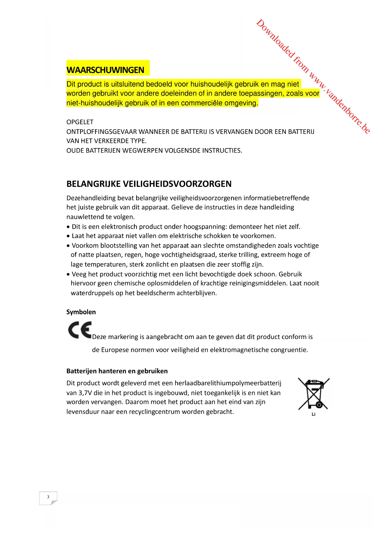 Downloaded from www.vandenborre.be3 WAARSCHUWINGEN Dit product is uitsluitend bedoeld voor huishoudelijk gebruik en mag niet worden gebruikt voor andere doeleinden of in andere toepassingen, zoals voor niet-huishoudelijk gebruik of in een commerciële omgeving.