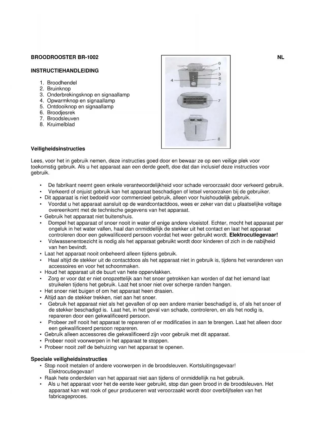 • Stop nooit metalen of andere voorwerpen in de broodsleuven. Kortsluitingsgevaar!