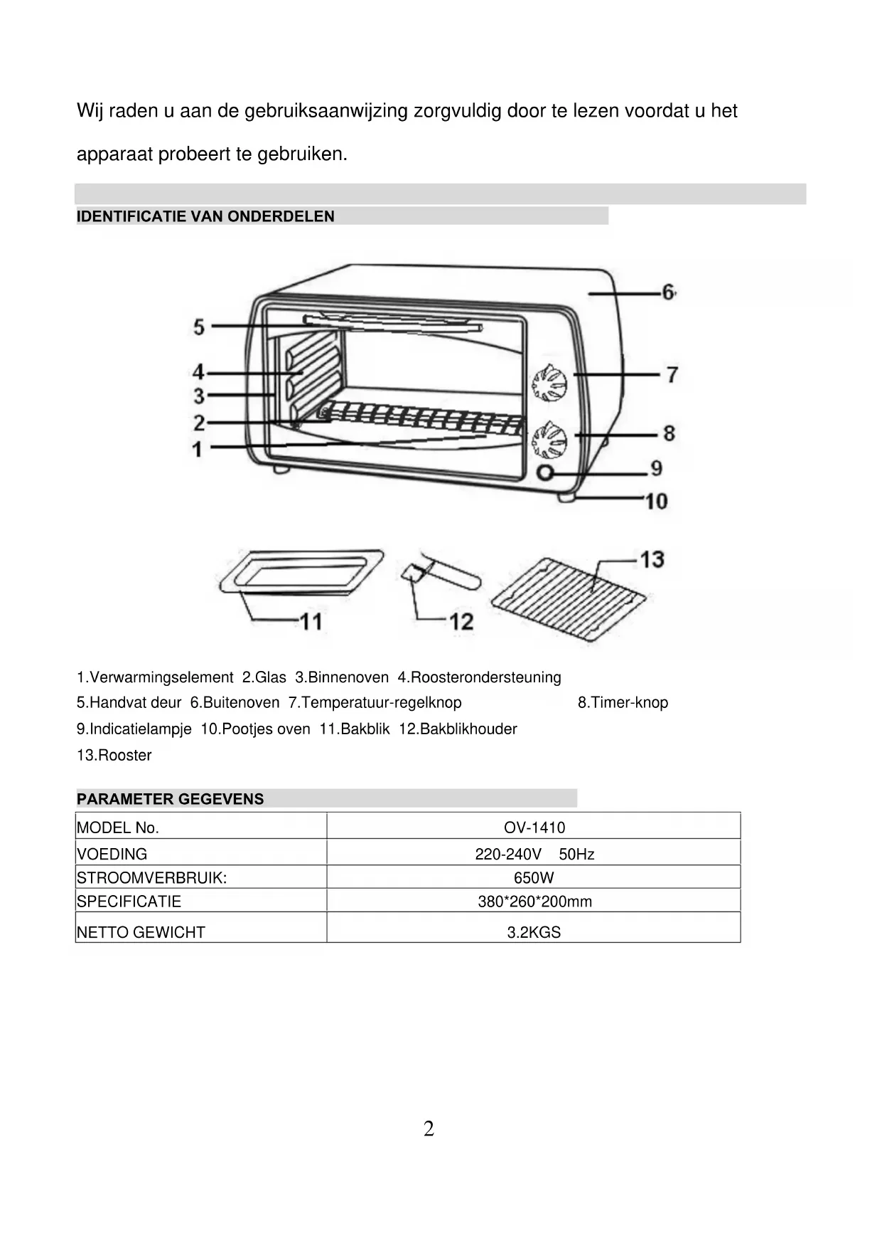 BEDIENINGSAANWIJZINGEN Bijzondere opmerking: De afbeeldingen van de accessories en onderdelen verschillen van model tot model. Let u s.v.p. op welk model u gekocht heeft. Bakblik en rooster Bakblik Gebruik van de bakblikhouder