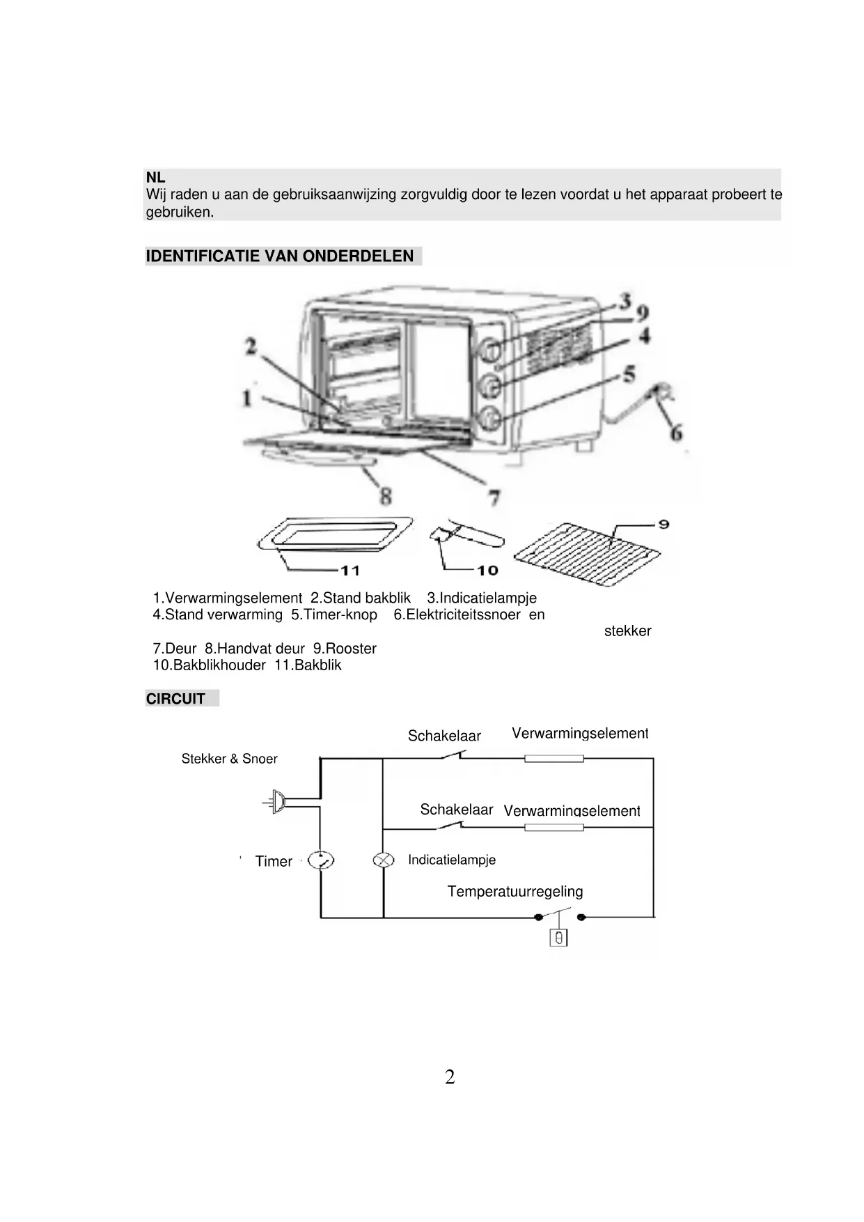 Temperatuurregeling3 SPECIFICATIES MODEL Nr. OV-1411 Voeding 220-240Vac 50Hz Stroomverbruik 1380W Afmetingen verpakking 495*363*346mm Netto gewicht 5.5KGS WAARSCHUWINGEN Bijzondere opmerking: De afbeeldingen van de accessories verschillen van model tot model. Let u s.v.p. of het model dat u gekocht heeft.