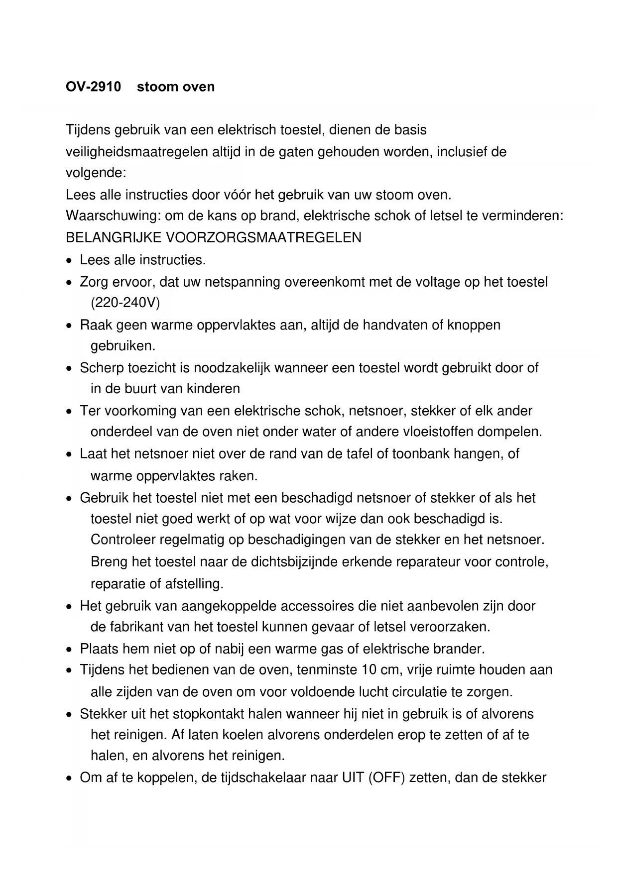 OV - 2910 pdfMachine by Broadgun Software - a great PDF writer! - a great PDF creator! - http://www.pdfmachine.com http://www.broadgun.comOV-2910 stoom oven Tijdens gebruik van een elektrisch toestel, dienen de basis veiligheidsmaatregelen altijd in de gaten gehouden worden, inclusief de volgende: Lees alle instructies door vóór het gebruik van uw stoom oven. Waarschuwing: om de kans op brand, elektrische schok of letsel te verminderen: BELANGRIJKE VOORZORGSMAATREGELEN Lees alle instructies. Zorg ervoor, dat uw netspanning overeenkomt met de voltage op het toestel (220-240V) Raak geen warme oppervlaktes aan, altijd de handvaten of knoppen gebruiken. Scherp toezicht is noodzakelijk wanneer een toestel wordt gebruikt door of in de buurt van kinderen Ter voorkoming van een elektrische schok, netsnoer, stekker of elk ander onderdeel van de oven niet onder water of andere vloeistoffen dompelen. Laat het netsnoer niet over de rand van de tafel of toonbank hangen, of warme oppervlaktes raken. Gebruik het toestel niet met een beschadigd netsnoer of stekker of als het toestel niet goed werkt of op wat voor wijze dan ook beschadigd is. Controleer regelmatig op beschadigingen van de stekker en het netsnoer. Breng het toestel naar de dichtsbijzijnde erkende reparateur voor controle, reparatie of afstelling. Het gebruik van aangekoppelde accessoires die niet aanbevolen zijn door de fabrikant van het toestel kunnen gevaar of letsel veroorzaken. Plaats hem niet op of nabij een warme gas of elektrische brander. Tijdens het bedienen van de oven, tenminste 10 cm, vrije ruimte houden aan alle zijden van de oven om voor voldoende lucht circulatie te zorgen. Stekker uit het stopkontakt halen wanneer hij niet in gebruik is of alvorens het reinigen. Af laten koelen alvorens onderdelen erop te zetten of af te halen, en alvorens het reinigen. Om af te koppelen, de tijdschakelaar naar UIT (OFF) zetten, dan de stekkereruit trekken. Altijd de stekker vasthouden, en nooit aan het netsnoer trekken. Uiterste voorzichtigheid is geboden tijdens het verplaatsen van een druipende pan met hete olie of andere hete vloeistoffen. Het kruimelblad of elk ander deel van de oven niet bedekken met aluminium folie. Dit kan oververhitting van de oven veroorzaken. Uiterste voorzichtigheid gebruiken bij het verwijderen van het blad, rekken of bij het verwijderen van hete vetten of andere vloeistoffen. De binnenkant van de oven niet reinigen met metalen schuursponsjes, stukjes kunnen afbreken en elektrische onderdelen raken, waardoor de kans ontstaat op een elektrische schok. Bovenmaats etens- of metalen keukengerei mag niet in rooster oven geplaatst worden daar zij brand of een elektrische schok kunnen veroorzaken. Brand kan ontstaan als de oven bedekt wordt of brandbaar materiaal raakt tijdens de werking, inclusief de gordijnen, overgordijnen, wanden, en vergelijkbare materialen. Uiterste voorzichtigheid uitoefenen tijdens het gebruik van kook of bak pannen/schalen die niet gemaakt zijn van metaal of ovenvast glas. Zorg ervoor dat niets de boven of onder elementen van de oven aanraakt. Plaats geen van de volgende materialen in de oven: karton, plastic, papier, of dergelijke. Plaats geen andere materialen anders dan de door de fabrikant aanbevolen accessoires in deze oven als hij niet wordt gebruikt. Draag altijd beschermende, geïsoleerde ovenwanten tijdens het inzetten en uithalen van voorwerpen uit de hete oven. Dit toestel heeft een getemperde deur, van veiligheids glas. Het glas is sterker dan normaal en meer bestand tegen breken. Getemperd glas kan desondanks aan de randen breken. Voorkom het krassen van het oppervlak van de deur of het kerven van de randen. De temperatuur van de bereikbare oppervlaktes kunnen hoog zijn tijdens werking van het toestel. En de oppervlaktes kunnen heet worden tijdens gebruik. Gebruik hem niet buitenshuis. Gebruik het toestel niet anders dan waar hij voor bestemd is Dit toestel is ALLEEN VOOR HUISHOUDELIJK GEBRUIK. Bewaar het instructieblad. HOOFD BESTANDDEEL