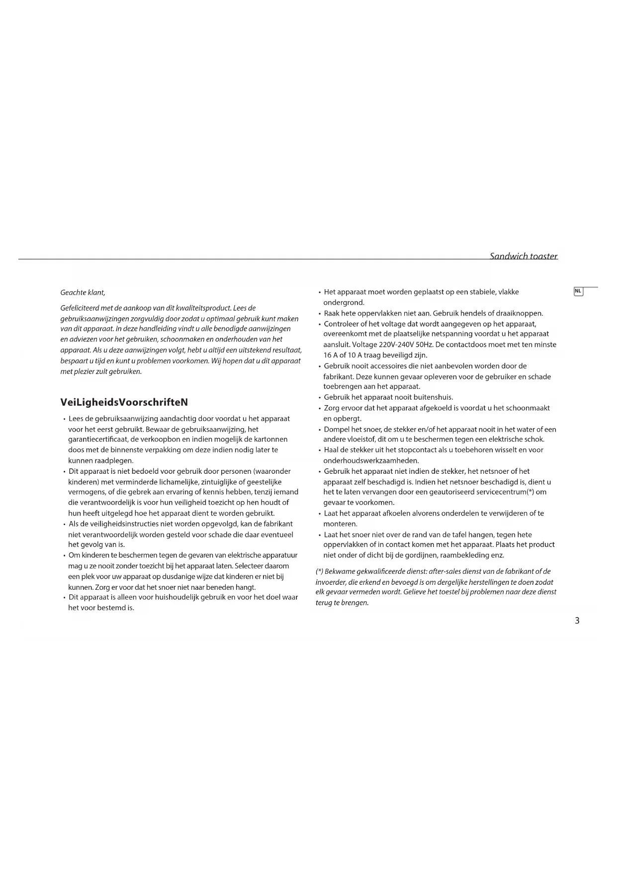 • De sandwich toaster mag op grond van elektrische veiligheid niet