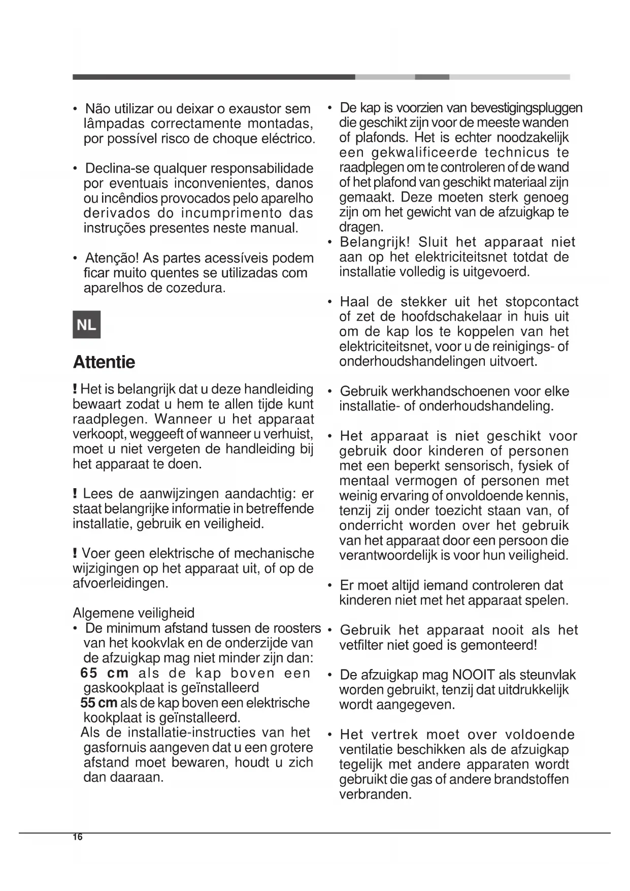 - Atenção! As partes acessíveis podem car muito quentes se utilizadas com aparelhos de cozedura. Attentie ! Het is belangrijk dat u deze handleiding bewaart zodat u hem te allen tijde kunt raadplegen. Wanneer u het apparaat verkoopt, weggeeft of wanneer u verhuist, moet u niet vergeten de handleiding bij het apparaat te doen. ! Lees de aanwijzingen aandachtig: er staat belangrijke informatie in betreffende installatie, gebruik en veiligheid. ! Voer geen elektrische of mechanische wijzigingen op het apparaat uit, of op de afvoerleidingen. Algemene veiligheid