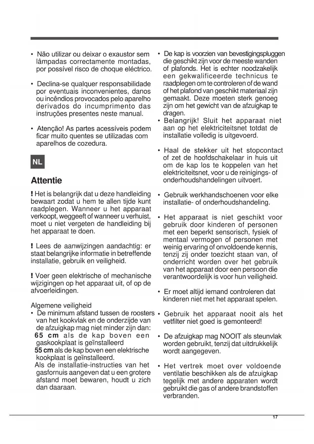 - Atenção! As partes acessíveis podem car muito quentes se utilizadas com aparelhos de cozedura. Attentie ! Het is belangrijk dat u deze handleiding bewaart zodat u hem te allen tijde kunt raadplegen. Wanneer u het apparaat verkoopt, weggeeft of wanneer u verhuist, moet u niet vergeten de handleiding bij het apparaat te doen. ! Lees de aanwijzingen aandachtig: er staat belangrijke informatie in betreffende installatie, gebruik en veiligheid. ! Voer geen elektrische of mechanische wijzigingen op het apparaat uit, of op de afvoerleidingen. Algemene veiligheid