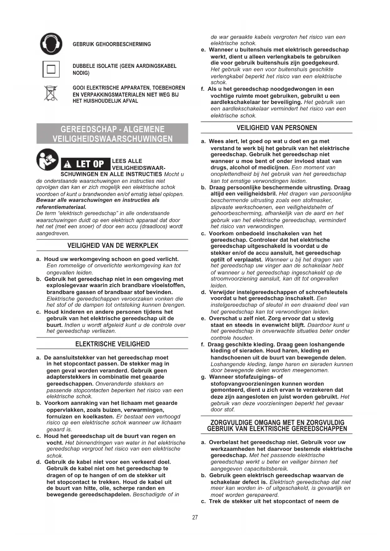 ZORGVULDIGE OMGANG MET EN ZORGVULDIG GEBRUIK VAN ELEKTRISCHE GEREEDSCHAPPEN a. Overbelast het gereedschap niet. Gebruik voor uw werkzaamheden het daarvoor bestemde elektrische gereedschap. Met het passende elektrische gereedschap werkt u beter en veiliger binnen het aangegeven capaciteitsbereik.b. Gebruik geen elektrisch gereedschap waarvan de schakelaar defect is. Elektrisch gereedschap dat niet meer kan worden in- of uitgeschakeld, is gevaarlijk en moet worden gerepareerd.c. Trek de stekker uit het stopcontact of neem de 27accu uit het elektrische gereedschap voordat u het gereedschap instelt, toebehoren wisselt of het gereedschap weglegt. Deze voorzorgsmaatregel voorkomt onbedoeld starten van het gereedschap. d. Bewaar niet-gebruikte elektrische gereedschappen buiten bereik van kinderen. Laat het gereedschap niet gebruiken door personen die er niet mee vertrouwd zijn en deze aanwijzingen niet hebben gelezen. Elektrische gereedschappen zijn gevaarlijk wanneer deze door onervaren personen worden gebruikt.e. Verzorg het gereedschap zorgvuldig. Controleer of bewegende delen van het gereedschap correct functioneren en niet vastklemmen en of onderdelen zodanig gebroken of beschadigd zijn dat de werking van het gereedschap nadelig wordt beïnvloed. Laat deze beschadigde onderdelen voor het gebruik repareren. Veel ongevallen hebben hun oorzaak in slecht onderhouden van elektrische gereedschappen.f. Houd snijdende inzetgereedschappen scherp en schoon. Zorgvuldig onderhouden snijdende inzetgereedschappen met scherpe snijkanten klemmen minder snel vast en zijn gemakkelijker te geleiden.g. Gebruik elektrisch gereedschap, toebehoren, inzetgereedschappen en dergelijke volgens deze aanwijzingen. Let daarbij op de arbeidsomstandigheden en de uit te voeren werkzaamheden. Het gebruik van elektrische gereedschappen voor andere dan de voorziene toepassingen kan tot gevaarlijke situaties leiden. ONDERHOUD a. Laat het gereedschap alleen repareren door gekwaliceerd en vakkundig personeel en alleen met originele vervangingsonderdelen. Daarmee wordt gewaarborgd dat de veiligheid van het gereedschap in stand blijft.