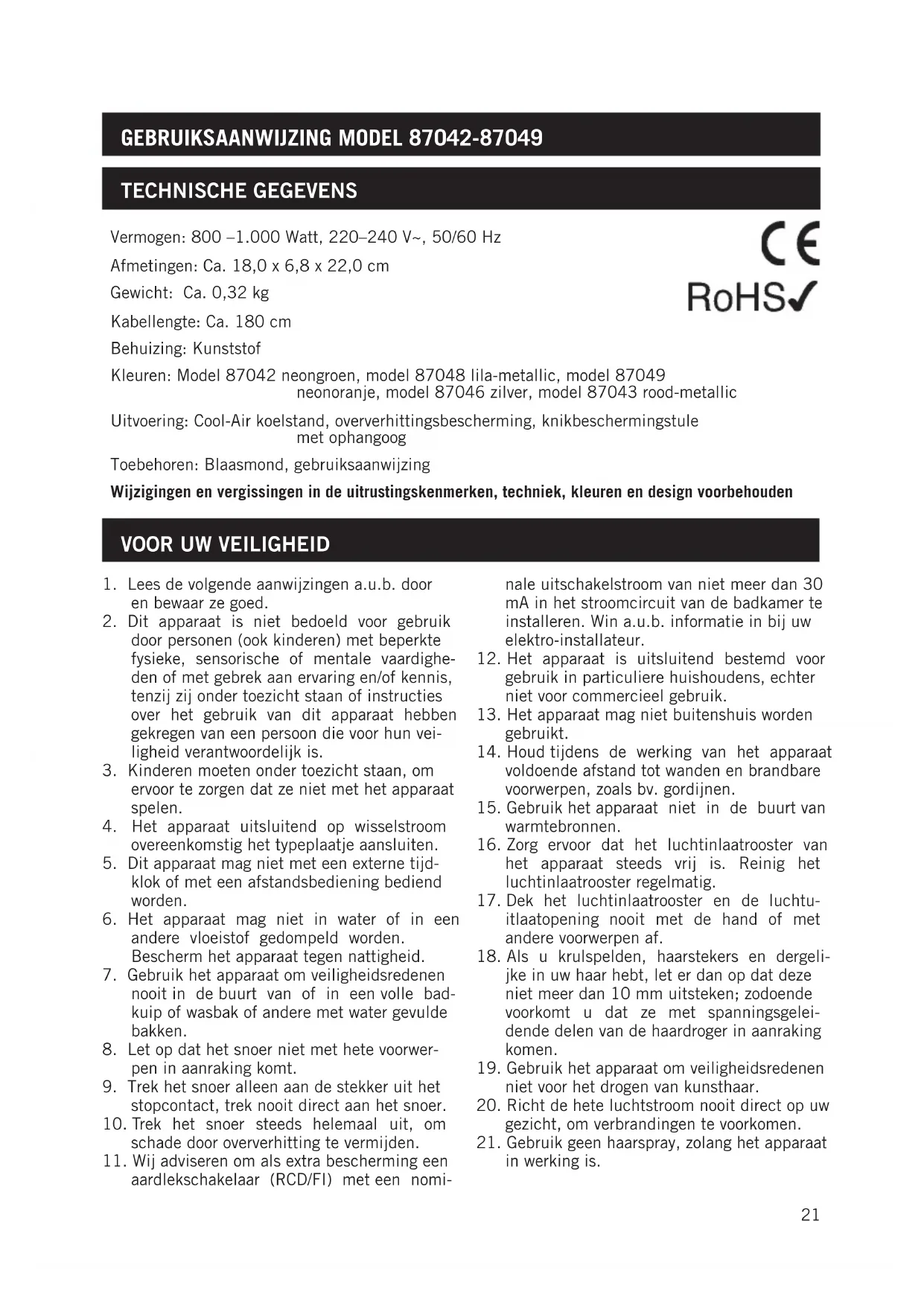 GEBRUIKSAANWIJZING MODEL 87042-87049
