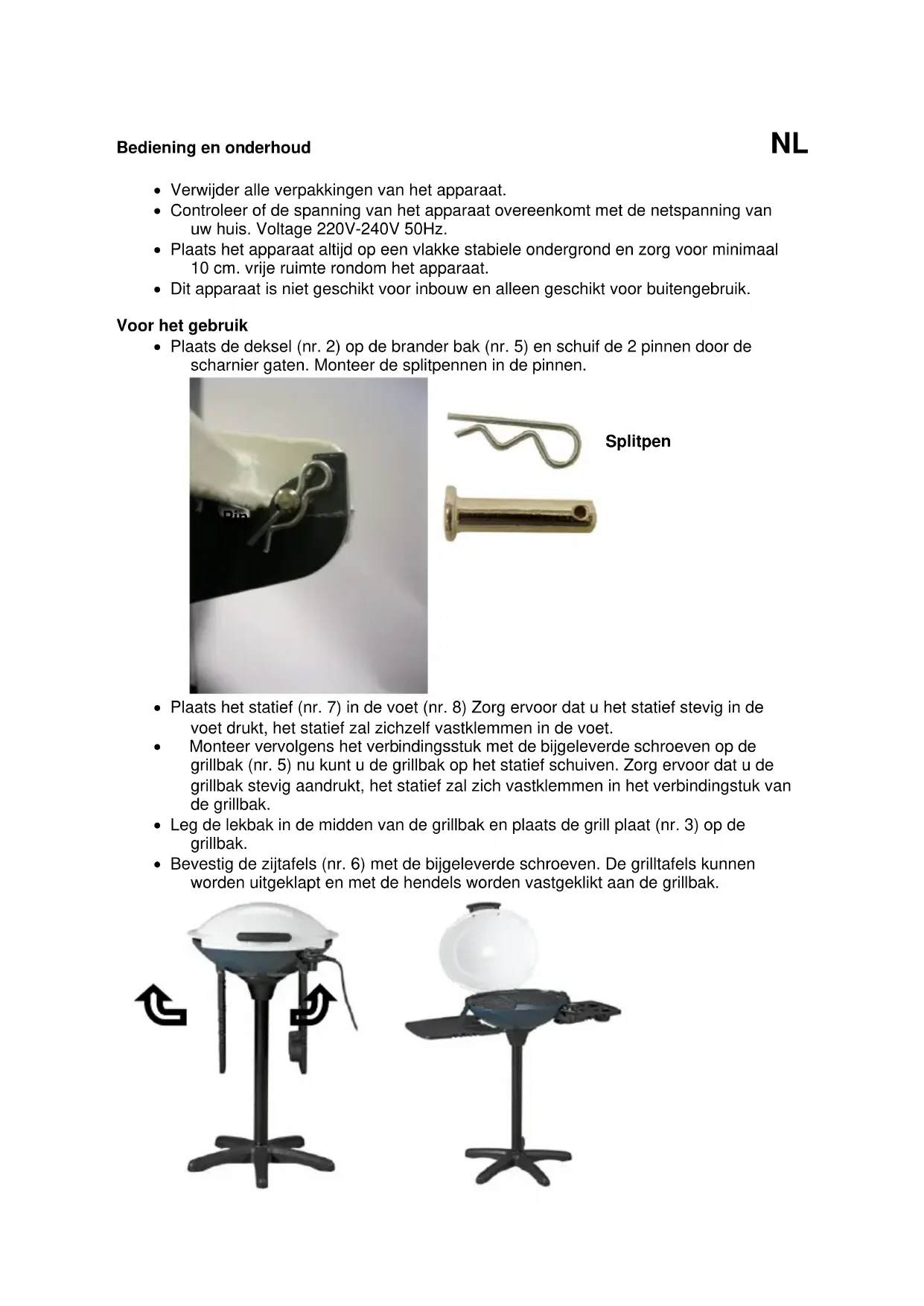 Let op ! Het apparaat wordt zeer heet, raak deze niet aan. Open de deksel (nr. 2) altijd met het handvat (nr. 1). Gebruik altijd gereedschap om de etenswaren op de grill (nr. 3) te draaien of erop te leggen en eraf te halen.