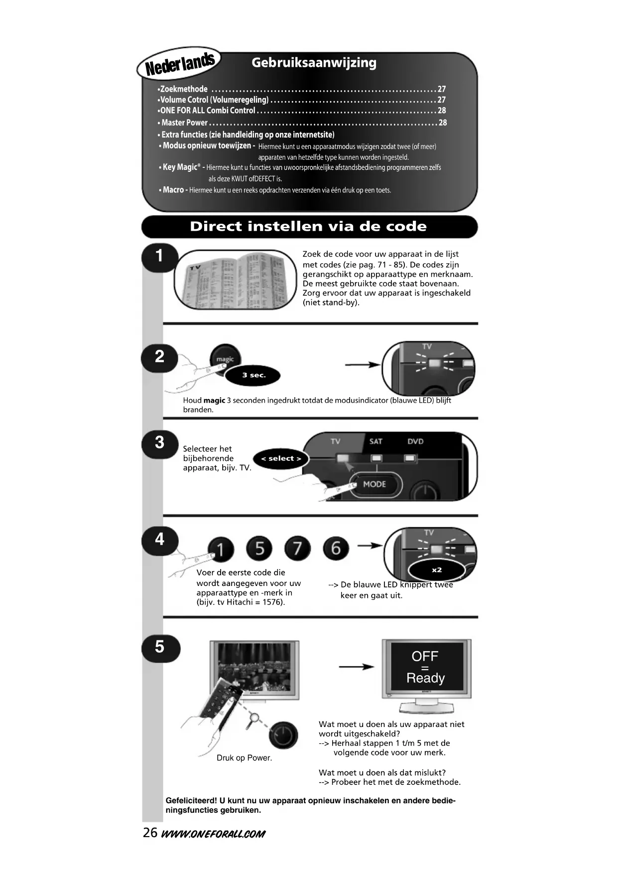 • Master Power . . . . . . . . . . . . . . . . . . . . . . . . . . . . . . . . . . . . . . . . . . . . . . . . . . . . . . . . . . . . . . . . . . 28 • Extra functies (zie handleiding op onze internetsite)• Modus opnieuw toewijzen - Hiermee kunt u een apparaatmodus wijzigen zodat twee (of meer) a pparaten van hetzelfde type kunnen worden ingesteld. • Key Magic® - Hiermee kunt u functies van uwoorspronkelijke afstandsbediening programmeren zelfs als deze KWIJT ofDEFECT is.• Macro - Hiermee kunt u een reeks opdrachten verzenden via één druk op een toets. OFF