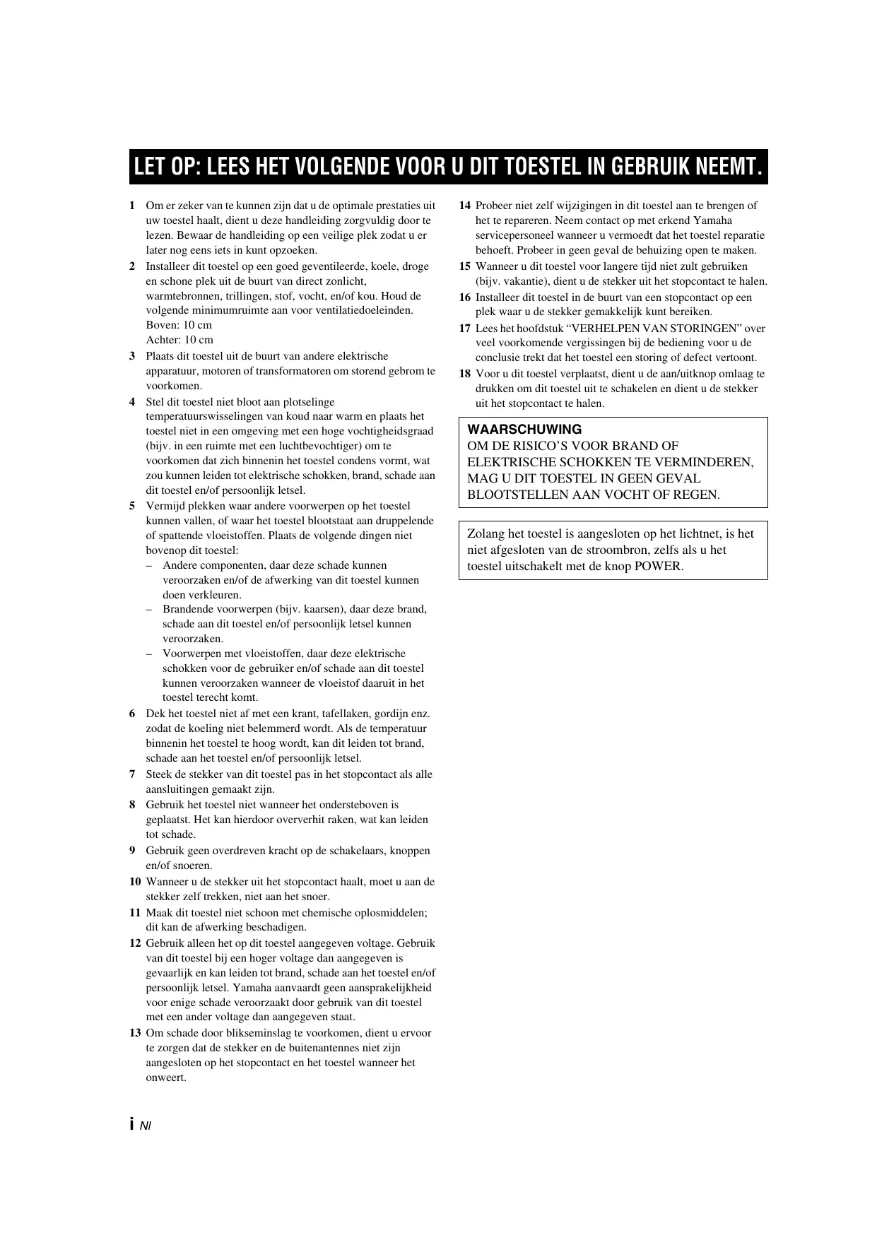LET OP: LEES HET VOLGENDE VOOR U DIT TOESTEL IN GEBRUIK NEEMT. 1 Om er zeker van te kunnen zijn dat u de optimale prestaties uit uw toestel haalt, dient u deze handleiding zorgvuldig door te lezen. Bewaar de handleiding op een veilige plek zodat u er later nog eens iets in kunt opzoeken. 2 Installeer dit toestel op een goed geventileerde, koele, droge en schone plek uit de buurt van direct zonlicht, warmtebronnen, trillingen, stof, vocht, en/of kou. Houd de volgende minimumruimte aan voor ventilatiedoeleinden. Boven: 10 cm Achter: 10 cm 3 Plaats dit toestel uit de buurt van andere elektrische apparatuur, motoren of transformatoren om storend gebrom te voorkomen. 4 Stel dit toestel niet bloot aan plotselinge temperatuurswisselingen van koud naar warm en plaats het toestel niet in een omgeving met een hoge vochtigheidsgraad (bijv. in een ruimte met een luchtbevochtiger) om te voorkomen dat zich binnenin het toestel condens vormt, wat zou kunnen leiden tot elektrische schokken, brand, schade aan dit toestel en/of persoonlijk letsel. 5 Vermijd plekken waar andere voorwerpen op het toestel kunnen vallen, of waar het toestel blootstaat aan druppelende of spattende vloeistoffen. Plaats de volgende dingen niet bovenop dit toestel: – Andere componenten, daar deze schade kunnen veroorzaken en/of de afwerking van dit toestel kunnen doen verkleuren. – Brandende voorwerpen (bijv. kaarsen), daar deze brand, schade aan dit toestel en/of persoonlijk letsel kunnen veroorzaken. – Voorwerpen met vloeistoffen, daar deze elektrische schokken voor de gebruiker en/of schade aan dit toestel kunnen veroorzaken wanneer de vloeistof daaruit in het toestel terecht komt. 6 Dek het toestel niet af met een krant, tafellaken, gordijn enz. zodat de koeling niet belemmerd wordt. Als de temperatuur binnenin het toestel te hoog wordt, kan dit leiden tot brand, schade aan het toestel en/of persoonlijk letsel. 7 Steek de stekker van dit toestel pas in het stopcontact als alle aansluitingen gemaakt zijn. 8 Gebruik het toestel niet wanneer het ondersteboven is geplaatst. Het kan hierdoor oververhit raken, wat kan leiden tot schade. 9 Gebruik geen overdreven kracht op de schakelaars, knoppen en/of snoeren. 10 Wanneer u de stekker uit het stopcontact haalt, moet u aan de stekker zelf trekken, niet aan het snoer. 11 Maak dit toestel niet schoon met chemische oplosmiddelen; dit kan de afwerking beschadigen. 12 Gebruik alleen het op dit toestel aangegeven voltage. Gebruik van dit toestel bij een hoger voltage dan aangegeven is gevaarlijk en kan leiden tot brand, schade aan het toestel en/of persoonlijk letsel. Yamaha aanvaardt geen aansprakelijkheid voor enige schade veroorzaakt door gebruik van dit toestel met een ander voltage dan aangegeven staat. 13 Om schade door blikseminslag te voorkomen, dient u ervoor te zorgen dat de stekker en de buitenantennes niet zijn aangesloten op het stopcontact en het toestel wanneer het onweert.