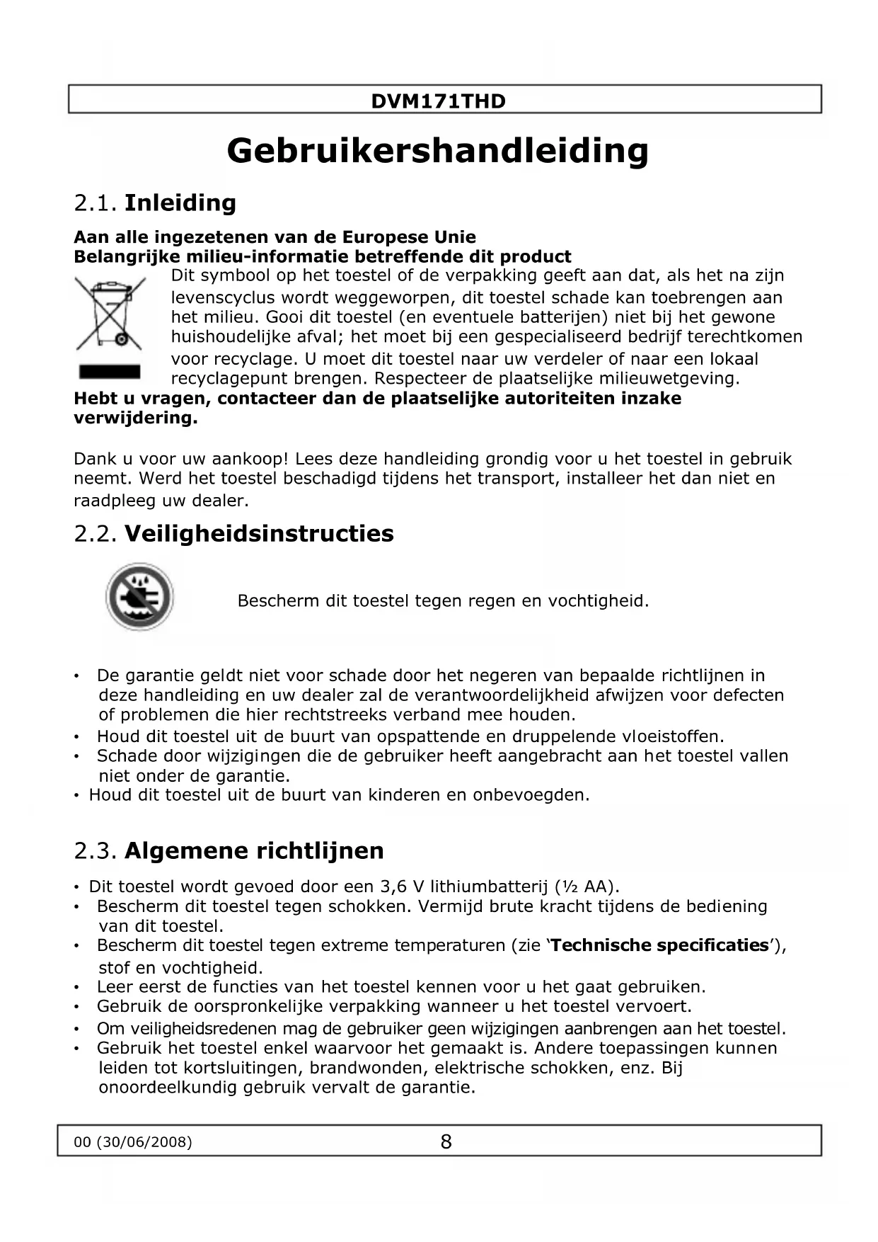 Dit symbolism op het toestel of de verpakking geeft aan dat, als het na+zijn levenscylclus worden weggeworpen, dit toestel schade kan toebrengen aan het milieu. Gooi dit toestel (en eventuele batterijen) Niet bij het gewone huishoudelijkke afval; het要去 bij een gespecialiseerd bedrijfterechtkomen voor recyclage. U要去 dit toestel maar uw verdeler ofaar een lokaal recyclagepunt brengen. Respecteer deplaatselijkke milieuuwetgeving.