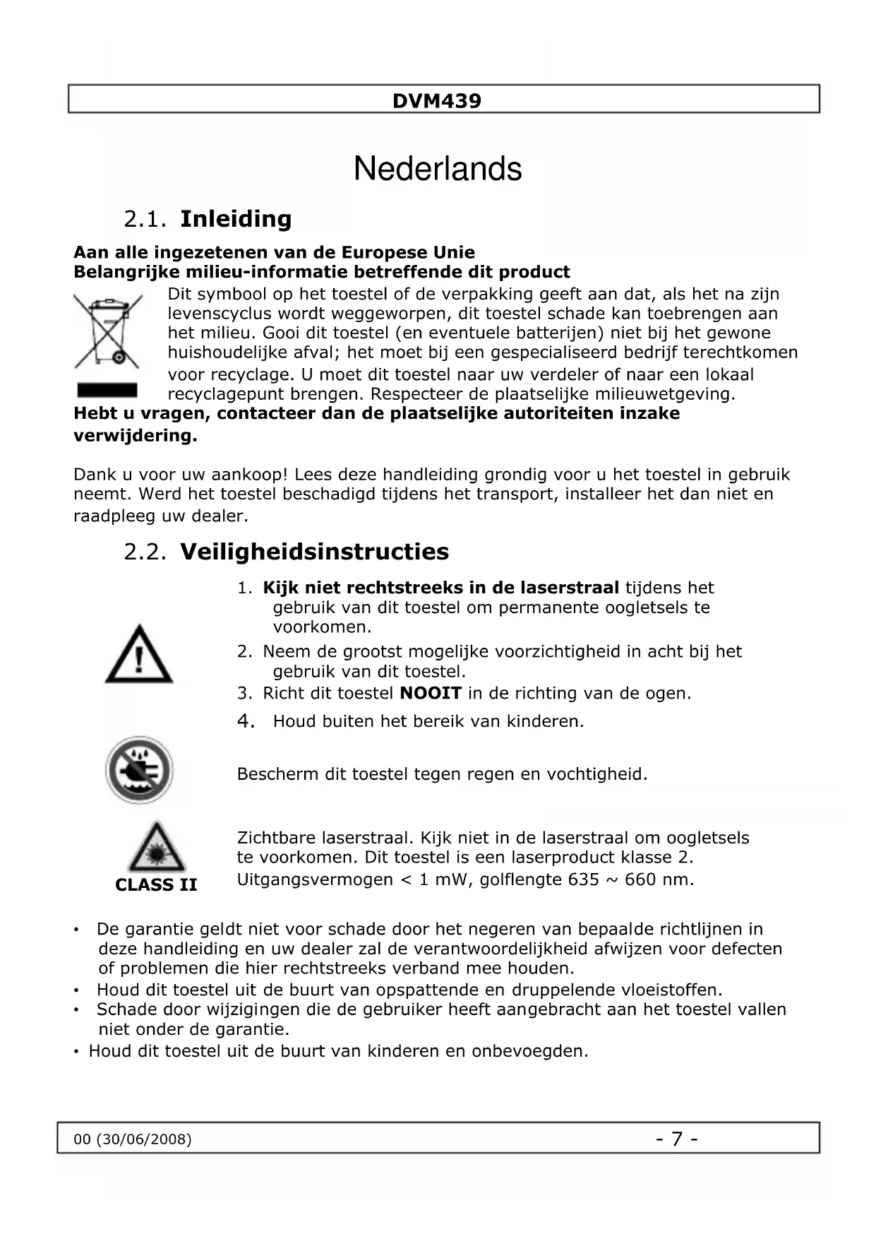 - Dit is een laserproduct klasse 2 (uitgangsvermogen < 1 mW, golfänge 635 ~ 660 nm). KIJK NIET IN DE LASERSTRAAL om oogletsels te voorkomen.