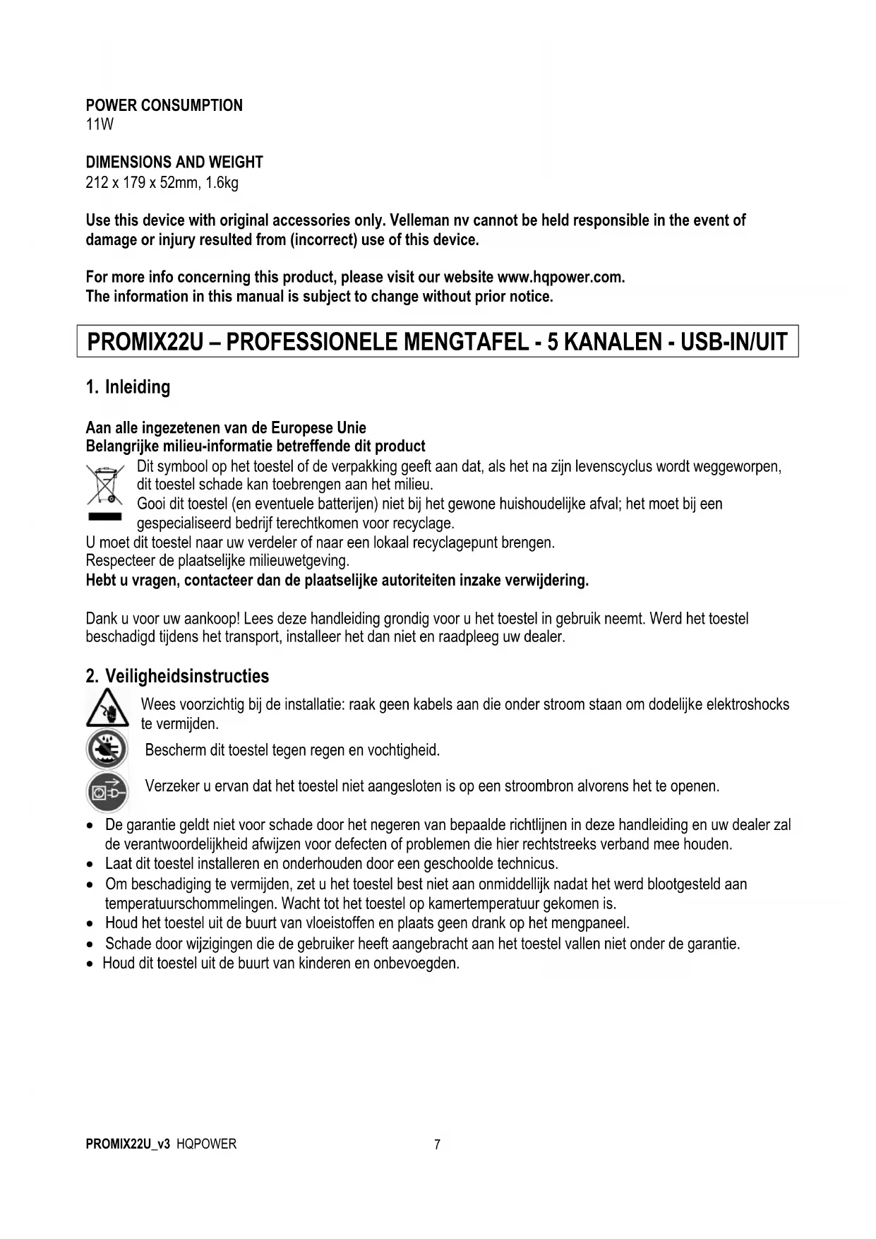 - Houd dit toestel uit de buurt van kinderen en onbevoegden. Wees voorzichtig bij de installatie: raak geen kabels aan die onder stroom staan om dodelijke elektroshocks te vermijden. Bescherm dit toestel tegen regen en vochtigheid. Verzeker u ervan dat het toestel niet aangesloten is op een stroombron alvorens het te openen.PROMIX22U_v3 HQPOWER