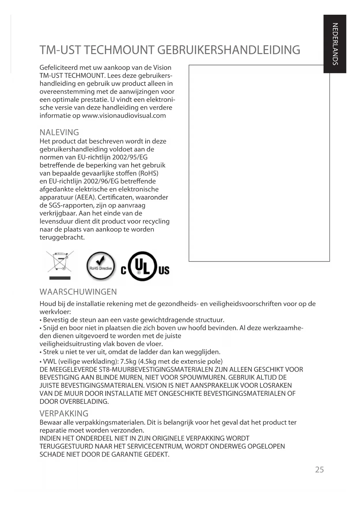 TM-UST TECHMOUNT GEBRUIKERSHANDLEIDING NALEVING Het product dat beschreven wordt in deze