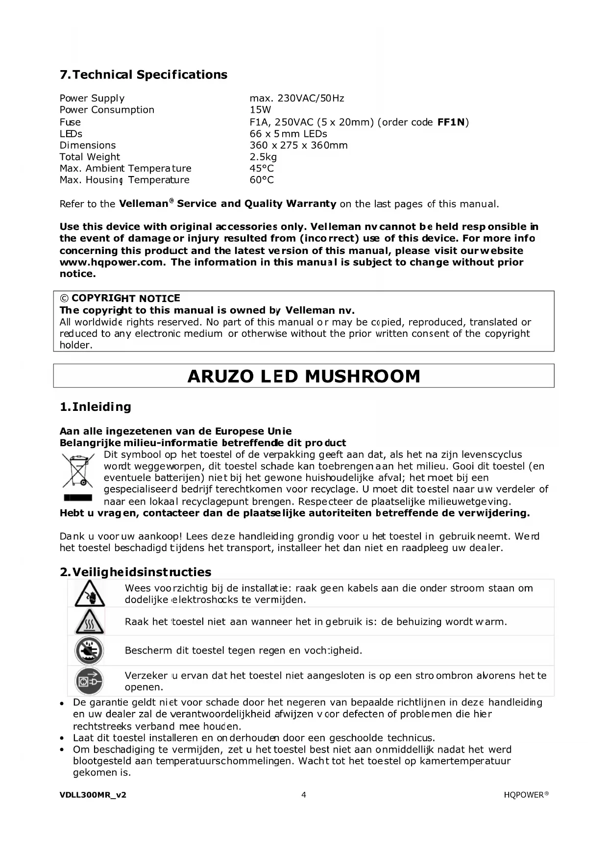 service- en kwaliteitsgarantie achteraan deze handleiding. Gebruik dit toestel enkel met originele accessoires. Velleman nv is niet aansprakelijk voor schade of kwetsuren bij (verkeerd) gebruik van dit toestel. Voor meer informatie over dit product en de laatste versie van deze handleiding, zie www.hqpower.com. De informatie in deze handleiding kan te allen tijde worden gewijzigd zonder voorafgaande kennisgeving. © AUTEURSRECHT Velleman nv heeft het auteursrecht voor deze handleiding. Alle wereldwijde rechten voorbehouden. Het is niet toegestaan om deze handleiding of gedeelten ervan over te nemen, te kopiëren, te vertalen, te bewerken en op te slaan op een elektronisch medium zonder voorafgaande schriftelijke toestemming van de rechthebbende.V