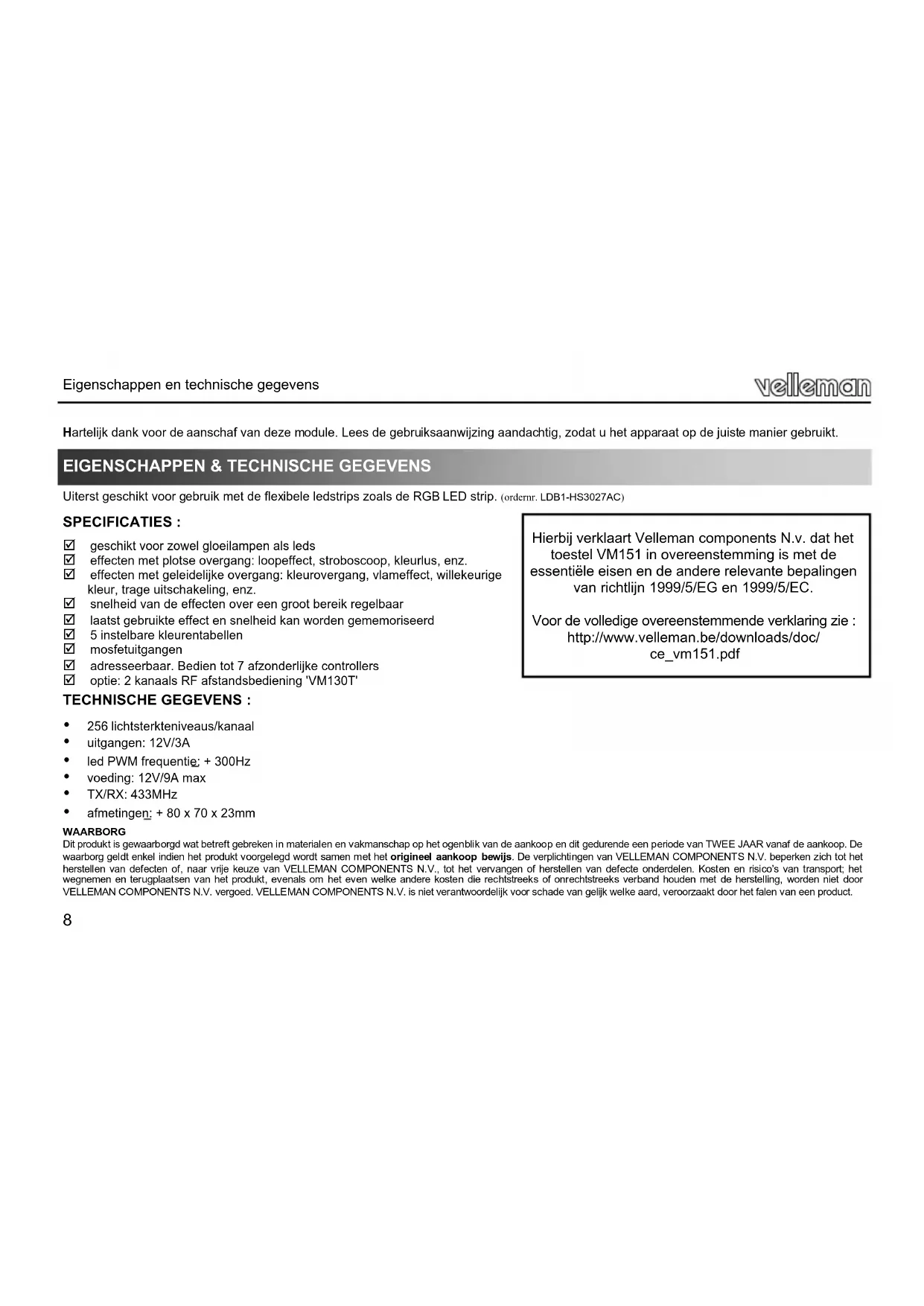 Voor de volledige overeenstemmende verklaring zich : http://www.velleman.be/downloads/doc/ ce_vm151.pdf