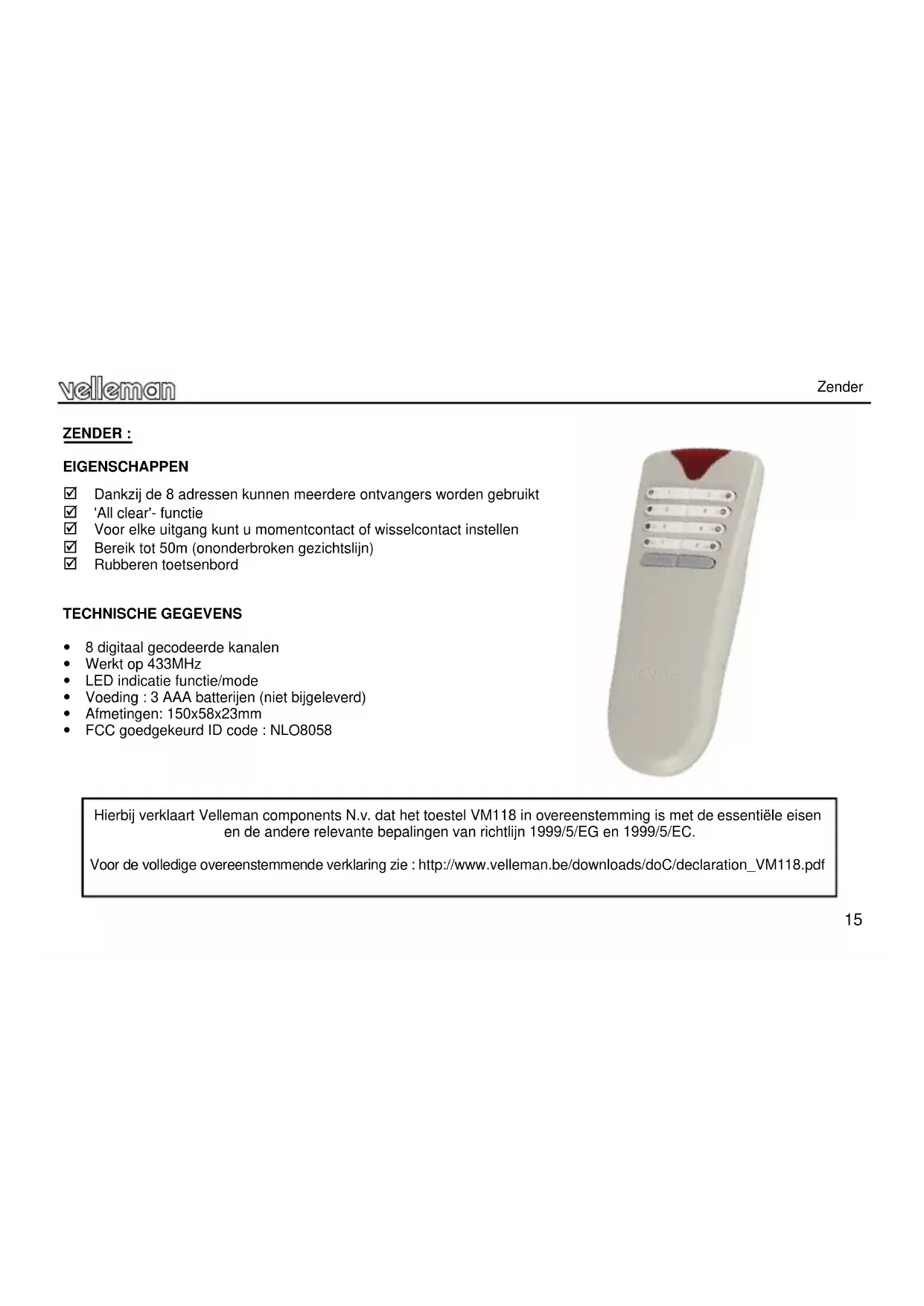 TECHNISCHE GEGEVENS 8 digitaal gecodeerde kanalen Werkt op 433MHz LED indicatie functie/mode Voeding : 3 AAA batterijen (niet bijgeleverd) Afmetingen: 150x58x23mm FCC goedgekeurd ID code : NLO8058 Hierbij verklaart Velleman components N.v. dat het toestel VM118 in overeenstemming is met de essentiële eisen en de andere relevante bepalingen van richtlijn 1999/5/EG en 1999/5/EC. Voor de volledige overeenstemmende verklaring zie : http://www.velleman.be/downloads/doC/declaration_VM118.pdf16 GEBRUIK Zender Plaats drie AAA batterijen in de batterijhouder (zie figuur) Opmerking : Respecteer de nationale en lokale wetten wanneer u lege batterijen weggooit.