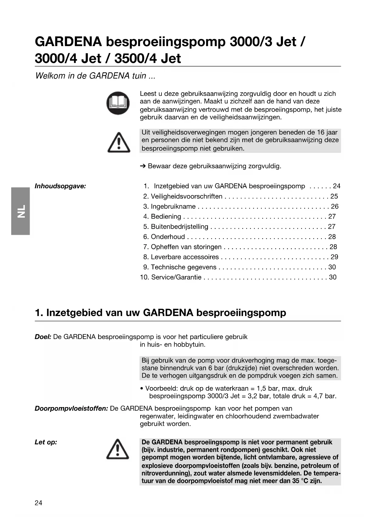 Inhoudsopgave: 1. Inzetgebied van uw GARDENA besproeiingspomp . . . . . . 24