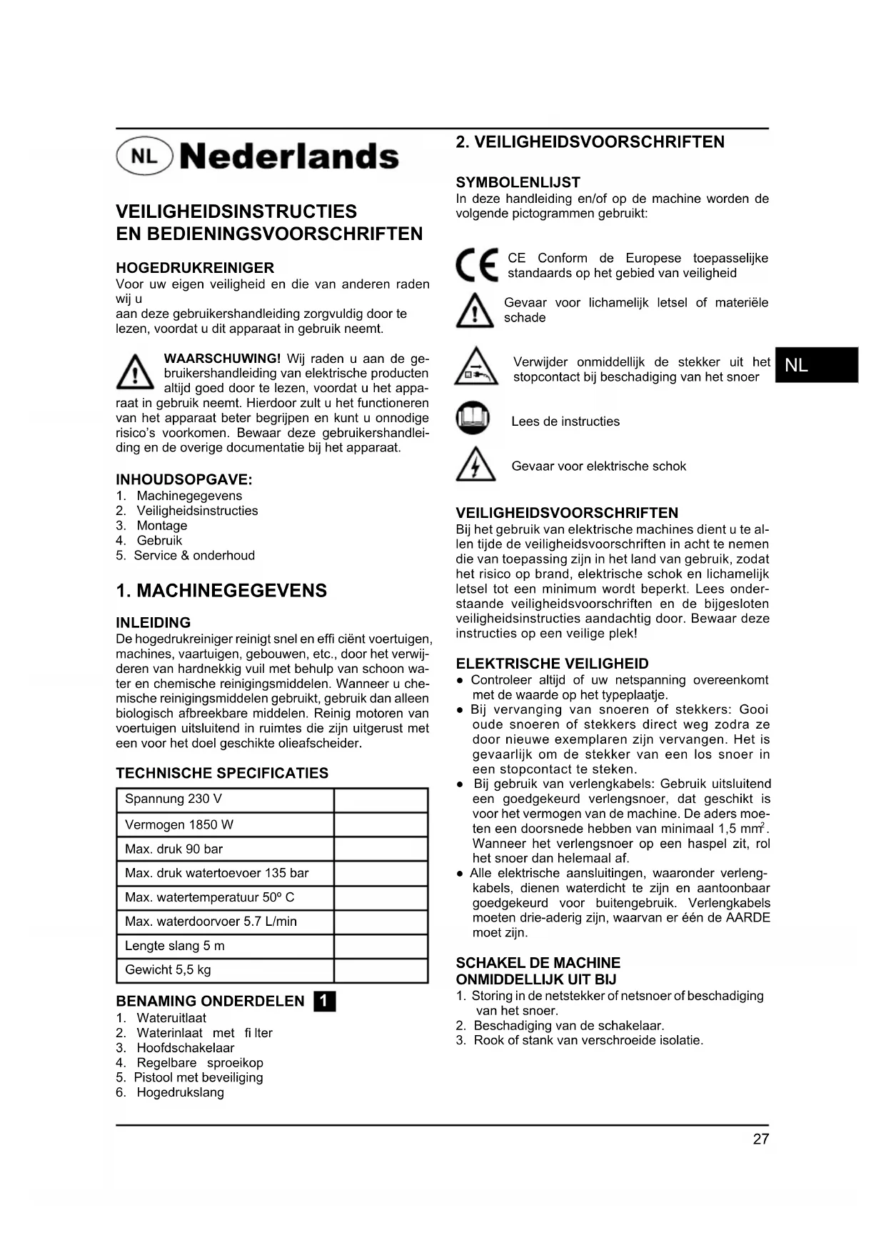 HOGEDRUKREINIGER LET OP: Ontkoppel de hogedrukslang nooit van de machine als het systeem nog onder druk staat. ● GEVAAR VOOR ONGEVALLEN. Onderhouds - en/of reparatiewerkzaamheden van- elektrische componenten MOETEN worden uitgevoerd door bevoegd personeel. ● GEVAAR VOOR VERWONDINGEN. LAAT EERST DE RESTDRUK ONTSNAPPEN, voor- dat u de slang van de hogedrukreiniger afkoppelt. ● GEVAAR VOOR ONGEVALLEN. CONTROLEER voordat u de hogedrukreiniger gebruikt altijd eerst of alle schroeven goed zijn aangedraaid en of er geen beschadigde en/of versleten onder- delen zijn.