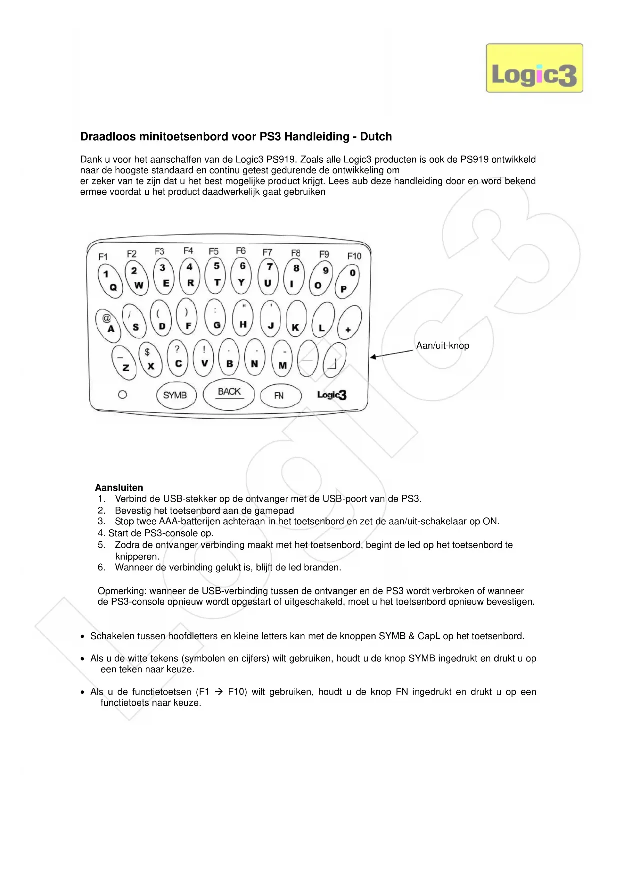 Als u de sluimerstand wilt verlaten, drukt u op een toets van het toetsenbord Waarschuwingsfunctie batterijen Wanneer de batterijen van het toetsenbord leeg dreigen te raken, begint de led op het toetsenbord te knipperen, waardoor u weet dat de batterijen vervangen moeten worden. LET OP: Zorg ervoor dat de batterijen correct geplaatst worden. Zoniet kan dit leiden tot verwondingen en schade aan het toetsenbord. Mogelijke problemen Probleem Oplossing Het toetsenbord maakt geen verbinding. Ga na of de ontvanger verbonden is met de PS3. Ga na of de aan/uit-knop op ON staat. De led brandt niet. Ga na of de aan/uit-knop op ON staat. Zorg ervoor dat de batterijen correct geplaatst zijn. Vervang de batterijen. De tekens worden niet correct weergegeven op het scherm. Controleer of wijzig de instellingen bij Type toetsenbord in het PS3-menu. De witte cijfers en symbolen worden niet weergegeven op het scherm. Ga na of u de knop SYMB of FN ingedrukt houdt wanneer u op de toets met het witte teken in kwestie drukt. Ik kan het toetsenbord niet bevestigen aan mijn gamepad. Het toetsenbord is specifiek ontworpen voor de officiële Sony PlayStation®3-gamepad of de Logic3 Stealth- gamepads. Conformity Hierbij verklaart Logic3 PLC dat het product PS3 Wireless Keyboard, voldoet aan de relevante voorwaarden en standaarden conform de 1999/5/EC richtlijn. U kunt een volledige declaratie van conformiteit opvragen via de contactgegevens op de laatste pagina van deze handleiding. Mocht u problemen hebben bij het instellen van de PS3 Wireless Keyboard (PS919), raadpleeg dan onze technische hulplijn via +44 (0)19 23 47 10 00 (internationaal beltarief) of via e-mail support@logic3.com. Voor sommige modellen zijn reserveonderdelen verkrijgbaar op onze website, www.logic3.com Logic3Warning Follow all operating and usage instructions Do not submerge or use the Logic3 Product in or near water Do not disassemble any part of the Logic3 Product Do not place heavy objects on top of the Logic3 Product Do not allow small children to play with the Logic3 Product unsupervised Keep Logic3 Product away from extreme temperatures and store away from dust and humidity Unplug this product from the power source before cleaning Do not use liquid or aerosol cleaner, use only a damp cloth for cleaning For Spares/ Prices visit our website at www.logic3.com All other trademarks, copyrights and trade names are registered properties of their respective owners.Logic3 are continually updating their products in the interest of improving the quality and design. As a result, some features and the appearance of the product may vary from those shown on this packaging. Copyright in this manual is owned by Logic3 International Ltd. Rhodes Way, Rhodes Way, Watford WD24 4YW UK Tel: +44 (0) 1923 471 000 Email: support@logic3.com www.logic3.com Logic3Logic3