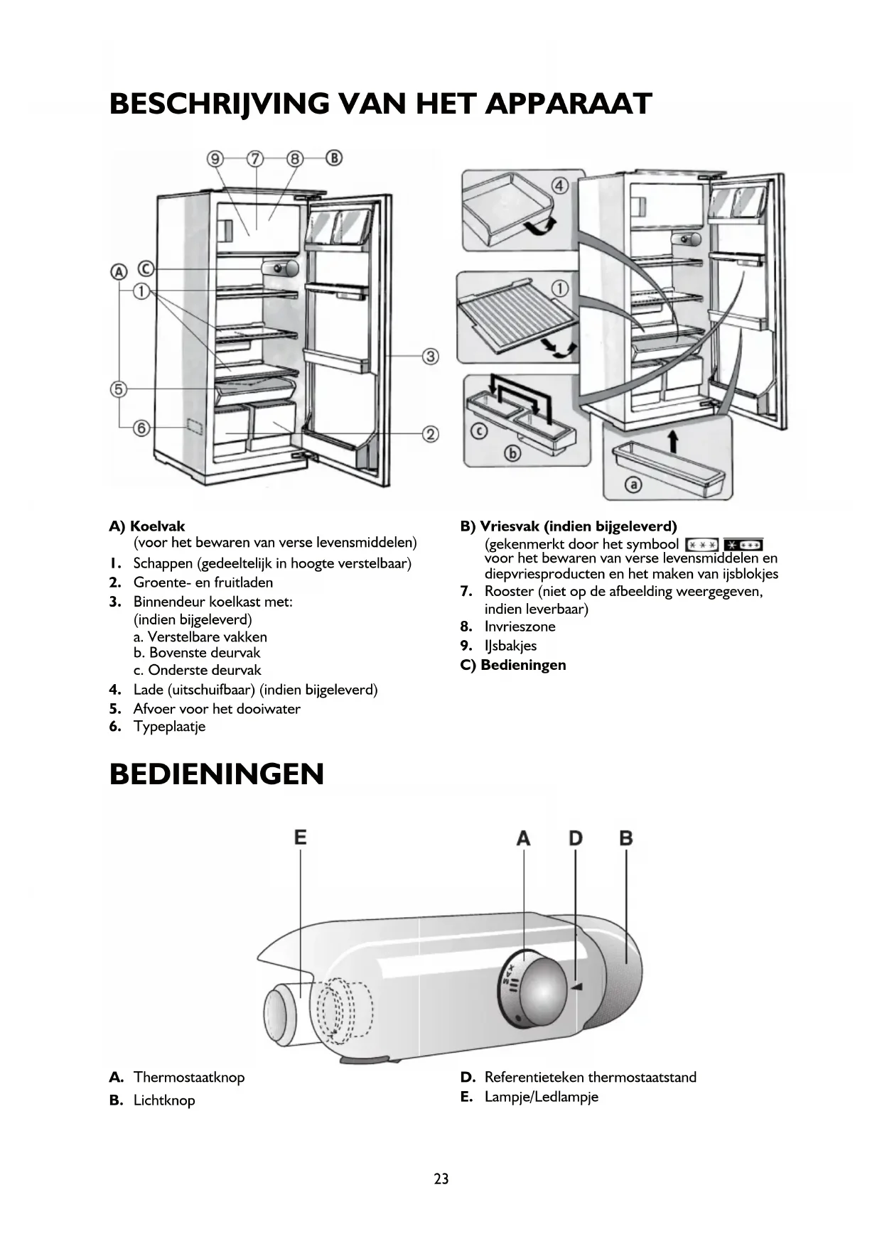 Binnendeur koelkast met: (indien bijgeleverd) a. Verstelbare vakken b. Bovenste deurvak c. Onderste deurvak