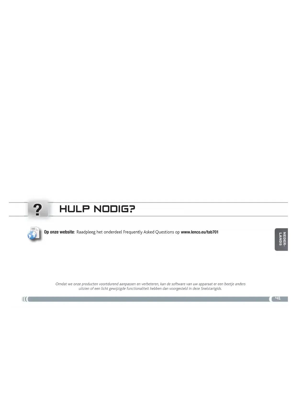 HULP NODIG? Omdat we onze producten voortdurend aanpassen en verbeteren, kan de software van uw apparaat er een beetje anders uitzien of een licht gewijzigde functionaliteit hebben dan voorgesteld in deze Snelstartgids. Op onze website: Raadpleeg het onderdeel Frequently Asked Questions op www.lenco.eu/tab70142