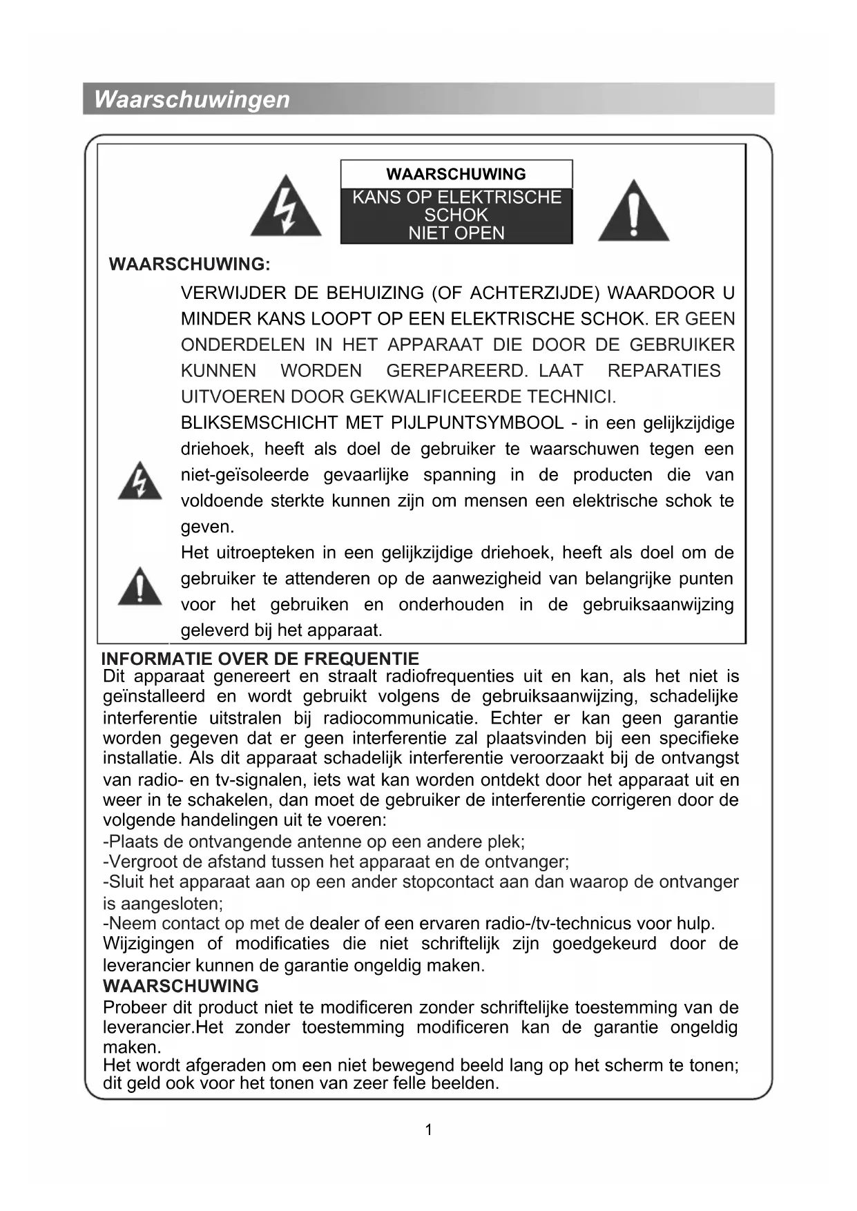 VERWIJDER DE BEHUIZING (OF ACHTERZIJDE) WAARDOOR U MINDER KANS LOOPT OP EEN ELEKTRISCHE SCHOK. ER GEEN ONDERDELEN IN HET APPARAAT DIE DOOR DE GEBRUiker KUNNEN WORDEN GEREPAREERD. LAAT REPARATIES UITVOEREN DOOR GEKWALIFICEERDE TECHNICI.