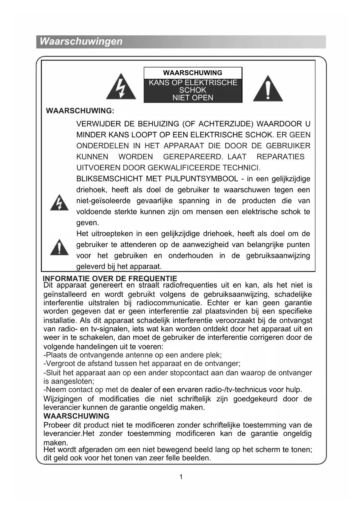 Dit apparaat genereert en straalt radiofrequenties uit en kan, als het niet is geïnstalleerd en wordt gebruikt volgens de gebruiksaanwijzing, schadelijke interferentie uitstralen bij radiocommunicatie. Echter er kan geen garantie worden gegeven dat er geen interferentie zal plaatsvinden bij een specifieke installatie. Als dit apparaat schadelijk interferentie veroorzaakt bij de ontvangst van radio- en tv-signalen, iets wat kan worden ontdekt door het apparaat uit en weer in te schakelen, dan moet de gebruiker de interferentie corrigeren door de volgende handelingen uit te voeren: -Plaats de ontvangende antenne op een andere plek; -Vergroot de afstand tussen het apparaat en de ontvanger; -Sluit het apparaat aan op een ander stopcontact aan dan waarop de ontvanger is aangesloten; -Neem contact op met de dealer of een ervaren radio-/tv-technicus voor hulp. Wijzigingen of modificaties die niet schriftelijk zijn goedgekeurd door de leverancier kunnen de garantie ongeldig maken. WAARSCHUWING Probeer dit product niet te modificeren zonder schriftelijke toestemming van de leverancier.Het zonder toestemming modificeren kan de garantie ongeldig maken. Het wordt afgeraden om een niet bewegend beeld lang op het scherm te tonen; dit geld ook voor het tonen van zeer felle beelden. Waarschuwingen 1WAARSCHUWING Stel dit apparaat niet bloot aan regen of vocht, dit om brandgevaar of de kans op een elektrische schok te verminderen. Gebruik het apparaat niet in een tropisch klimaat. De ventilatie mag niet geblokkeerd worden door de ventilatiegleuven af te dekken met bijvoorbeeld een krant, tafellakens, gordijnen etc. Het apparaat mag niet blootgesteld worden aan druppels of spatten en er mogen geen voorwerpen gevuld met vloeistof, zoals vazen, op het apparaat geplaatst worden. Let op de milieuaspecten van het weggooien van batterijen. Gooi batterijen niet in de vuilnisbak. Neem contact op met uw winkelier om het milieu te beschermen. Houdt een minimale afstand van 5 cm rondom het apparaat zodat het voldoende ventilatie heeft (minimale afstand rondom het apparaat voor voldoende ventilatie). Plaats geen open vuren, zoals brandende kaarsen op het apparaat. Houdt kaarsen of andere open vuren altijd uit de buurt van dit apparaat om brand te voorkomen. Het apparaat kan defect raken als het een elektrostatisch schok krijgt. Het kan weer worden geactiveerd door het apparaat uit en weer in te schakelen. WAARSCHUWING: het stroomsnoer aansluiten Bij de meeste apparaten wordt aanbevolen dat het wordt aangesloten op een speciaal stopcontact dat alleen stroom levert aan dat apparaat en geen extra stopcontacten of aftakkingen bevat. Zorg ervoor dat de stopcontacten niet overbelast raken. Stopcontacten die overbelast zijn, los zitten of beschadigd zijn, verlengsnoeren, gerafelde stroomsnoeren, of beschadigde of gebarsten stroomdraden zijn gevaarlijk. Elk van deze zaken kan leiden tot een elektrische schok of brand. Controleer het snoer van uw apparaat, en als er schade zichtbaar of slijtage zichtbaar is, dan moet u de stekker uit het stopcontact halen, het apparaat niet meer gebruiken en het snoer laten vervangen door exact hetzelfde type snoer door een geautoriseerde technicus. Controleer of het snoer niet fysiek of mechanisch beschadig kan raken zoals verdraaid zitten, geknikt kan raken, geknepen kan worden, tussen een deur kan komen of dat er op gestapt worden kan. Let vooral op pluggen, stopcontacten en het punt waar het snoer het apparaat verlaat. De voedingskabel wordt gebruikt als ontkoppeling, en het ontkoppelde apparaat kan gewoon gebruikt blijven worden. Afbeeldingen en illustraties in de gebruiksaanwijzing zijn er slechts ter referentie en kunnen afwijken van het daadwerkelijke product. Het ontwerp en de specificaties van het product kunnen zonder voorafgaande berichtgeving worden gewijzigd.