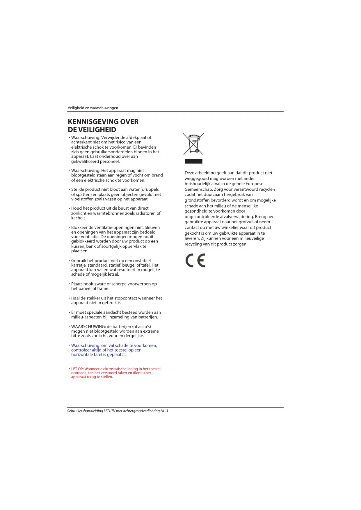 NL Gebruikershandleiding LED-TV met achtergrondverlichting NL-2KENNISGEVING OVER DE VEILIGHEID Waarschuwing: Verwijder de afdekplaat of