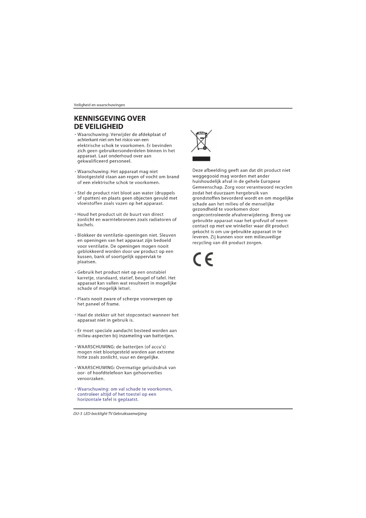 DU LED-backlight TV Gebruiksaanwijzing DU-2KENNISGEVING OVER DE VEILIGHEID Waarschuwing: Verwijder de afdekplaat of