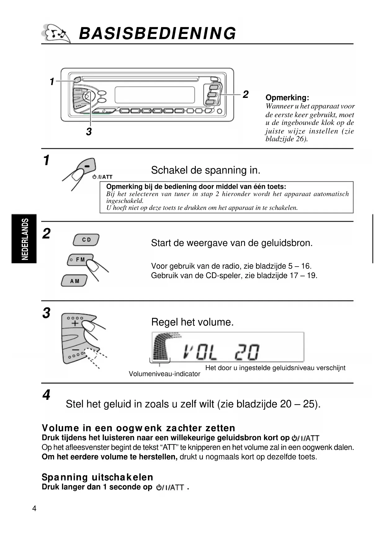 Volume in een oogwenk zachter zetten Druk tijdens het luisteren naar een willekeurige geluidsbron kort op . Op het afleesvenster begint de tekst “ATT” te knipperen en het volume zal in een oogwenk dalen. Om het eerdere volume te herstellen, drukt u nogmaals kort op dezelfde toets. Spanning uitschakelen Druk langer dan 1 seconde op . BASISBEDIENING Opmerking:Wanneer u het apparaat voorde eerste keer gebruikt, moetu de ingebouwde klok op dejuiste wijze instellen (ziebladzijde 26).Opmerking bij de bediening door middel van één toets:Bij het selecteren van tuner in stap 2 hieronder wordt het apparaat automatischingeschakeld.U hoeft niet op deze toets te drukken om het apparaat in te schakelen. 1