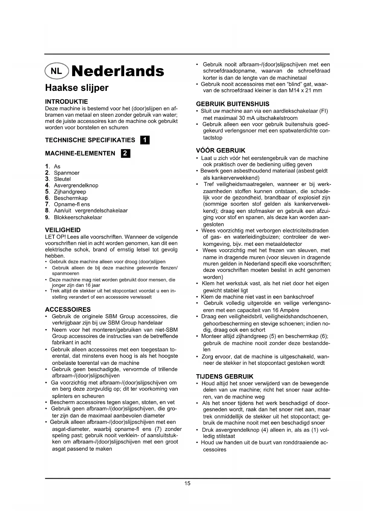 - Gebruik de originele SBM Group accessoires, die verkrijgbaar zijn bij uw SBM Group handelaar• Neem voor het monteren/gebruiken van niet-SBM Group accessoires de instructies van de betreffende fabrikant in acht• Gebruik alleen accessoires met een toegestaan to-erental, dat minstens even hoog is als het hoogste onbelaste toerental van de machine• Gebruik geen beschadigde, vervormde of trillende afbraam-/(door)slijpschijven• Ga voorzichtig met afbraam-/(door)slijpschijven om en berg deze zorgvuldig op; dit ter voorkoming van splinters en scheuren• Bescherm accessoires tegen slagen, stoten, en vet• Gebruik geen afbraam-/(door)slijpschijven, die gro-ter zijn dan de maximaal aanbevolen diameter• Gebruik alleen afbraam-/(door)slijpschijven met een asgat-diameter, waarbij opname-fl ens (7) zonder speling past; gebruik nooit verklein- of aansluitstuk-ken om afbraam-/(door)slijpschijven met een groot asgat passend te maken• Gebruik nooit afbraam-/(door)slijpschijven met een schroefdraadopname, waarvan de schroefdraad korter is dan de lengte van de machinetaal• Gebruik nooit accessoires met een “blind” gat, waar-van de schroefdraad kleiner is dan M14 x 21 mm GEBRUIK BUITENSHUIS