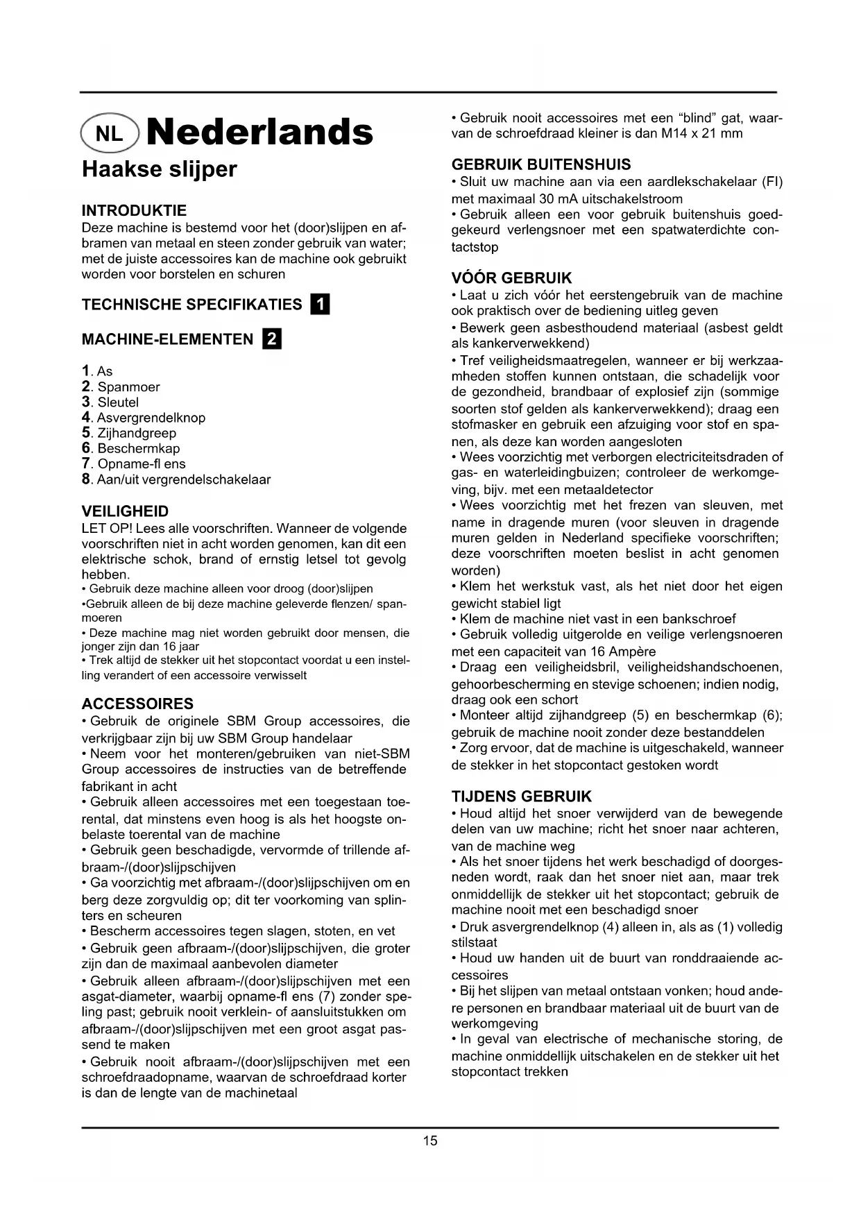 - Gebruik de originele SBM Group accessoires, die verkrijgbaar zijn bij uw SBM Group handelaar• Neem voor het monteren/gebruiken van niet-SBM Group accessoires de instructies van de betreffende fabrikant in acht• Gebruik alleen accessoires met een toegestaan toe-rental, dat minstens even hoog is als het hoogste on-belaste toerental van de machine• Gebruik geen beschadigde, vervormde of trillende af-braam-/(door)slijpschijven• Ga voorzichtig met afbraam-/(door)slijpschijven om en berg deze zorgvuldig op; dit ter voorkoming van splin-ters en scheuren• Bescherm accessoires tegen slagen, stoten, en vet• Gebruik geen afbraam-/(door)slijpschijven, die groter zijn dan de maximaal aanbevolen diameter• Gebruik alleen afbraam-/(door)slijpschijven met een asgat-diameter, waarbij opname-fl ens (7) zonder spe-ling past; gebruik nooit verklein- of aansluitstukken om afbraam-/(door)slijpschijven met een groot asgat pas-send te maken• Gebruik nooit afbraam-/(door)slijpschijven met een schroefdraadopname, waarvan de schroefdraad korter is dan de lengte van de machinetaal• Gebruik nooit accessoires met een “blind” gat, waar-van de schroefdraad kleiner is dan M14 x 21 mm GEBRUIK BUITENSHUIS