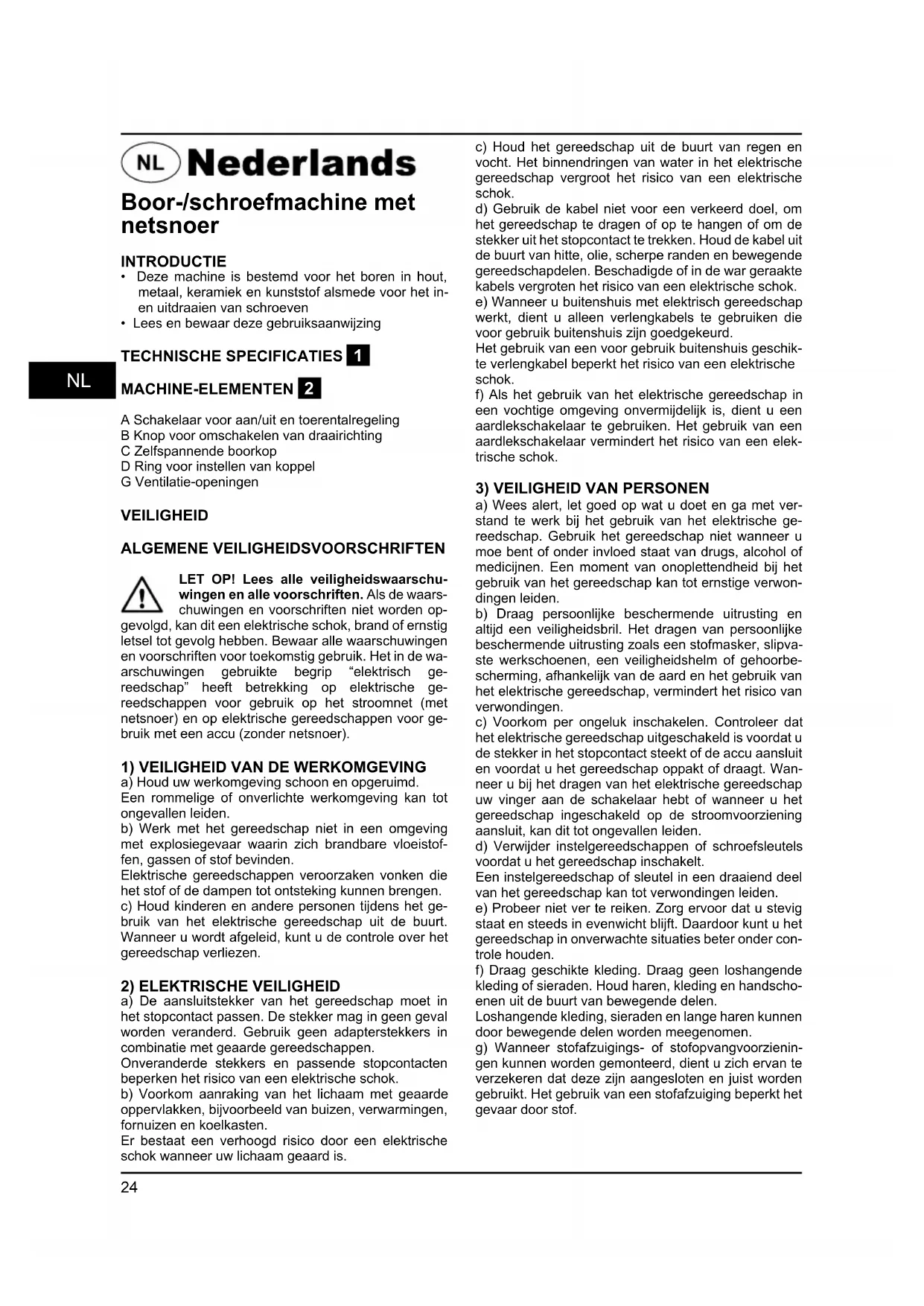 - Lees en bewaar deze gebruiksaanwijzing TECHNISCHE SPECIFICATIES 1 MACHINE-ELEMENTEN 2 A Schakelaar voor aan/uit en toerentalregeling B Knop voor omschakelen van draairichting C Zelfspannende boorkop D Ring voor instellen van koppel G Ventilatie-openingen VEILIGHEID ALGEMENE VEILIGHEIDSVOORSCHRIFTEN LET OP! Lees alle veiligheidswaarschu- wingen en alle voorschriften. Als de waars- chuwingen en voorschriften niet worden op- gevolgd, kan dit een elektrische schok, brand of ernstig letsel tot gevolg hebben. Bewaar alle waarschuwingen en voorschriften voor toekomstig gebruik. Het in de wa- arschuwingen gebruikte begrip “elektrisch ge- reedschap” heeft betrekking op elektrische ge- reedschappen voor gebruik op het stroomnet (met netsnoer) en op elektrische gereedschappen voor ge- bruik met een accu (zonder netsnoer).
