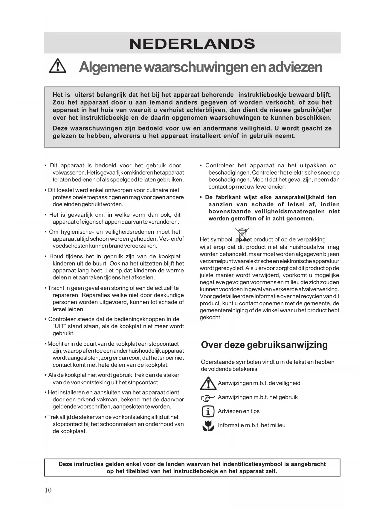 NEDERLANDS Algemene waarschuwingen en adviezen Het is uiterst belangrijk dat het bij het apparaat behorende instruktieboekje bewaard blijft.Zou het apparaat door u aan iemand anders gegeven of worden verkocht, of zou hetapparaat in het huis van waaruit u verhuist achterblijven, dan dient de nieuwe gebruik(st)erover het instruktieboekje en de daarin opgenomen waarschuwingen te kunnen beschikken.Deze waarschuwingen zijn bedoeld voor uw en andermans veiligheid. U wordt geacht zegelezen te hebben, alvorens u het apparaat installeert en/of in gebruik neemt.Deze instructies gelden enkel voor de landen waarvan het indentificatiesymbool is aangebrachtop het titelblad van het instructieboekje en het apparaat zelf.• Controleer het apparaat na het uitpakken opbeschadigingen. Controleer het elektrische snoer opbeschadigingen. Mocht dat het geval zijn, neem dancontact op met uw leverancier.• De fabrikant wijst elke aansprakelijkheid tenaanzien van schade of letsel af, indienbovenstaande veiligheidsmaatregelen nietwerden getroffen of in acht genomen.Het symbool op het product of op de verpakkingwijst erop dat dit product niet als huishoudafval magworden behandeld, maar moet worden afgegeven bij eenverzamelpunt waar elektrische en elektronische apparatuurwordt gerecycled. Als u ervoor zorgt dat dit product op dejuiste manier wordt verwijderd, voorkomt u mogelijkenegatieve gevolgen voor mens en milieu die zich zoudenkunnen voordoen in geval van verkeerde afvalverwerking.Voor gedetailleerdere informatie over het recyclen van ditproduct, kunt u contact opnemen met de gemeente, degemeentereiniging of de winkel waar u het product hebtgekocht.• Dit apparaat is bedoeld voor het gebruik doorvolwassenen. Het is gevaarlijk om kinderen het apparaatte laten bedienen of als speelgoed te laten gebruiken.• Dit toestel werd enkel ontworpen voor culinaire nietprofessionele toepassingen en mag voor geen anderedoeleinden gebruikt worden.• Het is gevaarlijk om, in welke vorm dan ook, ditapparaat of eigenschappen daarvan te veranderen.• Om hygienische- en veiligheidsredenen moet hetapparaat altijd schoon worden gehouden. Vet- en/ofvoedselresten kunnen brand veroorzaken.• Houd tijdens het in gebruik zijn van de kookplatkinderen uit de buurt. Ook na het uitzetten blijft hetapparaat lang heet. Let op dat kinderen de warmedelen niet aanraken tijdens het afkoelen.• Tracht in geen geval een storing of een defect zelf terepareren. Reparaties welke niet door deskundigepersonen worden uitgevoerd, kunnen tot schade ofletsel leiden.• Controleer steeds dat de bedieningsknoppen in de“UIT” stand staan, als de kookplat niet meer wordtgebruikt.• Mocht er in de buurt van de kookplat een stopcontactzijn, waarop af en toe een ander huishoudelijk apparaatwordt aangesloten, zorg er dan coor, dat het snoer nietcontact komt met hete delen van de kookplat.• Als de kookplat niet wordt gebruik, trek dan de stekervan de vonkontsteking uit het stopcontact.• Het installeren en aansluiten van het apparaat dientdoor een erkend vakman, bekend met de daarvoorgeldende voorschriften, aangesloten te worden.• Trek altijd de steker van de vonkontsteking altijd uit hetstopcontact bij het schoonmaken en onderhoud vande kookplaat.11