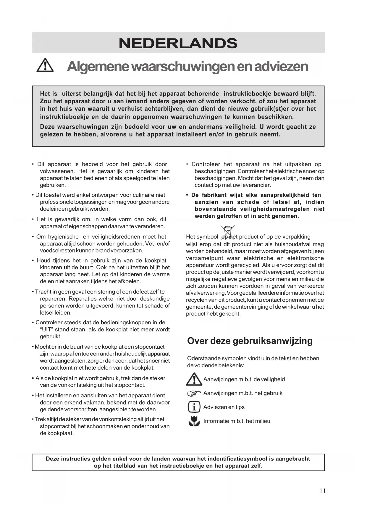 NEDERLANDS Algemene waarschuwingen en adviezen Het is uiterst belangrijk dat het bij het apparaat behorende instruktieboekje bewaard blijft.Zou het apparaat door u aan iemand anders gegeven of worden verkocht, of zou het apparaatin het huis van waaruit u verhuist achterblijven, dan dient de nieuwe gebruik(st)er over hetinstruktieboekje en de daarin opgenomen waarschuwingen te kunnen beschikken.Deze waarschuwingen zijn bedoeld voor uw en andermans veiligheid. U wordt geacht zegelezen te hebben, alvorens u het apparaat installeert en/of in gebruik neemt.Deze instructies gelden enkel voor de landen waarvan het indentificatiesymbool is aangebrachtop het titelblad van het instructieboekje en het apparaat zelf.• Controleer het apparaat na het uitpakken opbeschadigingen. Controleer het elektrische snoer opbeschadigingen. Mocht dat het geval zijn, neem dancontact op met uw leverancier.• De fabrikant wijst elke aansprakelijkheid tenaanzien van schade of letsel af, indienbovenstaande veiligheidsmaatregelen nietwerden getroffen of in acht genomen.Het symbool op het product of op de verpakkingwijst erop dat dit product niet als huishoudafval magworden behandeld, maar moet worden afgegeven bij eenverzamelpunt waar elektrische en elektronischeapparatuur wordt gerecycled. Als u ervoor zorgt dat ditproduct op de juiste manier wordt verwijderd, voorkomt umogelijke negatieve gevolgen voor mens en milieu diezich zouden kunnen voordoen in geval van verkeerdeafvalverwerking. Voor gedetailleerdere informatie over hetrecyclen van dit product, kunt u contact opnemen met degemeente, de gemeentereiniging of de winkel waar u hetproduct hebt gekocht.• Dit apparaat is bedoeld voor het gebruik doorvolwassenen. Het is gevaarlijk om kinderen hetapparaat te laten bedienen of als speelgoed te latengebruiken.• Dit toestel werd enkel ontworpen voor culinaire nietprofessionele toepassingen en mag voor geen anderedoeleinden gebruikt worden.• Het is gevaarlijk om, in welke vorm dan ook, ditapparaat of eigenschappen daarvan te veranderen.• Om hygienische- en veiligheidsredenen moet hetapparaat altijd schoon worden gehouden. Vet- en/ofvoedselresten kunnen brand veroorzaken.• Houd tijdens het in gebruik zijn van de kookplatkinderen uit de buurt. Ook na het uitzetten blijft hetapparaat lang heet. Let op dat kinderen de warmedelen niet aanraken tijdens het afkoelen.• Tracht in geen geval een storing of een defect zelf terepareren. Reparaties welke niet door deskundigepersonen worden uitgevoerd, kunnen tot schade ofletsel leiden.• Controleer steeds dat de bedieningsknoppen in de“UIT” stand staan, als de kookplat niet meer wordtgebruikt.• Mocht er in de buurt van de kookplat een stopcontactzijn, waarop af en toe een ander huishoudelijk apparaatwordt aangesloten, zorg er dan coor, dat het snoer nietcontact komt met hete delen van de kookplat.• Als de kookplat niet wordt gebruik, trek dan de stekervan de vonkontsteking uit het stopcontact.• Het installeren en aansluiten van het apparaat dientdoor een erkend vakman, bekend met de daarvoorgeldende voorschriften, aangesloten te worden.• Trek altijd de steker van de vonkontsteking altijd uit hetstopcontact bij het schoonmaken en onderhoud vande kookplaat.12