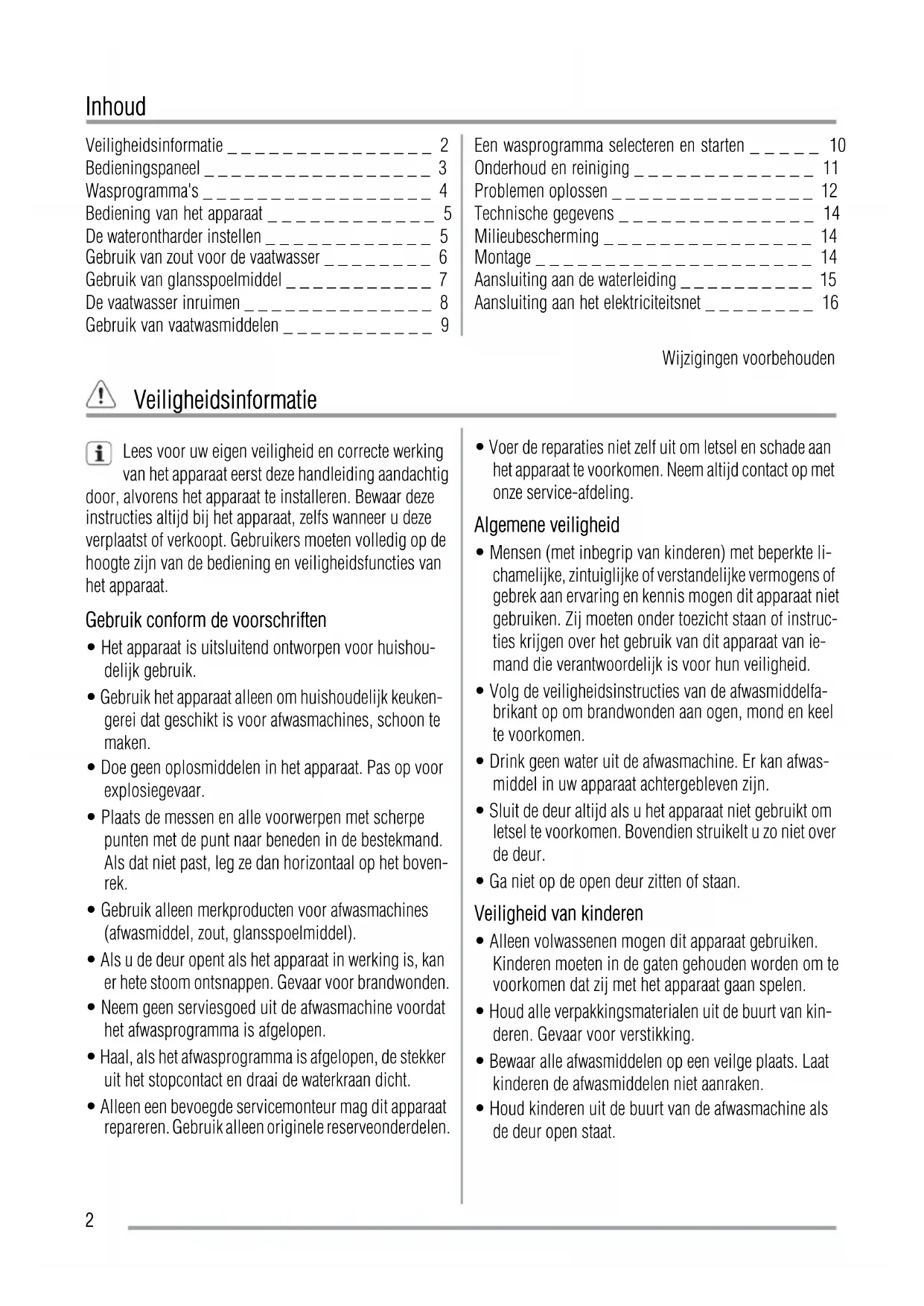 De binnendiameter mag niet kleiner zijn dan de diameter van de slang. Verwijder het kunststofmembraan (A) als u de wateraf- voerslang aan een sifon onder de gootsteen aansluit. Als u het membraan niet verwijdert, kunnen voedselresten een verstopping in de slang veroorzaken. Let op! Zorg er voor dat de waterkoppelingen stevig vast zitten om waterlekkage te voorkomen. 15Aansluiting aan het elektriciteitsnet Waarschuwing! De fabrikant is niet verantwoordelijk, als u deze veiligheidsmaatregelen niet opvolgt. Aard het apparaat volgens de veiligheidsmaatregelen. Zorg er voor dat het aangegeven voltage en het type stroom op het typeplaatje overeenkomen met het voltage en stroomtype van uw lokale stroomleverancier. Gebruik altijd een juist geïnstalleerd schokbestendig stopcontact. Gebruik geen meerwegspluggen, connectors en verlengsnoeren. Gevaar voor brand. Vervang de hoofdkabels niet zelf. Neem contact op met de service-afdeling. Zorg er voor dat de stekker toegankelijk is na de installatie. Trek niet aan de kabel om het apparaat los te halen. Trek altijd aan de stekker zelf. 16Contents Safety information _ _ _ _ _ _ _ _ _ _ _ _ _ _ _ _ 17 Control panel _ _ _ _ _ _ _ _ _ _ _ _ _ _ _ _ _ _ 18 Washing programmes _ _ _ _ _ _ _ _ _ _ _ _ _ _ 19 Use of the appliance _ _ _ _ _ _ _ _ _ _ _ _ _ _ _ 20 Setting the water softener _ _ _ _ _ _ _ _ _ _ _ _ 20 Use of dishwasher salt _ _ _ _ _ _ _ _ _ _ _ _ _ _ 21 Use of rinse aid _ _ _ _ _ _ _ _ _ _ _ _ _ _ _ _ _ 22 Loading cutlery and dishes _ _ _ _ _ _ _ _ _ _ _ _ 23 Use of detergent _ _ _ _ _ _ _ _ _ _ _ _ _ _ _ _ _ 24 Setting and starting a washing programme _ _ _ _ 25 Care and cleaning _ _ _ _ _ _ _ _ _ _ _ _ _ _ _ _ 26 What to do if… _ _ _ _ _ _ _ _ _ _ _ _ _ _ _ _ _ 27 Technical data _ _ _ _ _ _ _ _ _ _ _ _ _ _ _ _ _ _ 28 Environment concerns _ _ _ _ _ _ _ _ _ _ _ _ _ _ 29 Installation _ _ _ _ _ _ _ _ _ _ _ _ _ _ _ _ _ _ _ 29 Water connection _ _ _ _ _ _ _ _ _ _ _ _ _ _ _ _ 30 Electrical connection _ _ _ _ _ _ _ _ _ _ _ _ _ _ _ 30 Subject to change without notice Safety information For your safety and correct operation of the appli- ance, read this manual carefully before installation and use. Always keep these instructions with the appli- ance even if you move or sell it. Users must fully know the operation and safety features of the appliance. Correct use