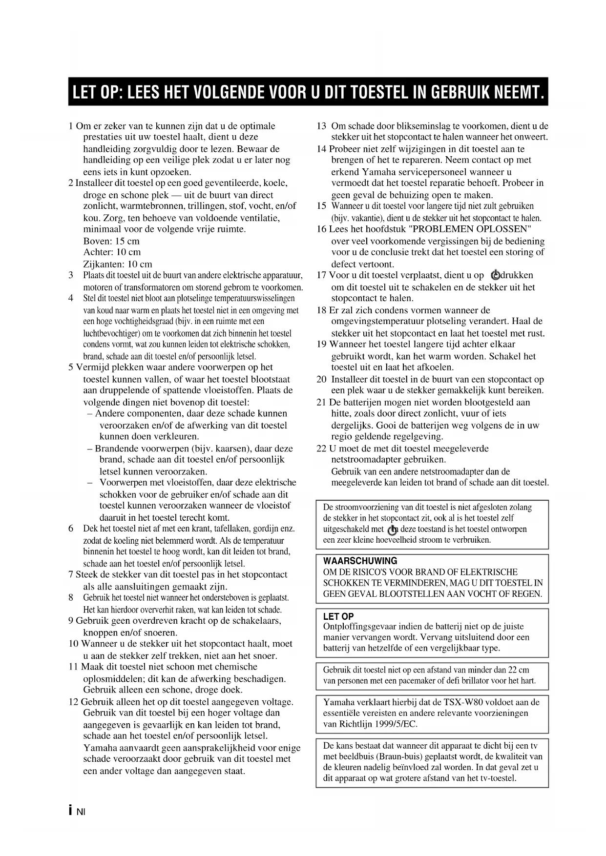 Installeer dit toestel in de buurt van een stopcontact op een plek waar u de stekker gemakkelijk kunt bereiken. 21 De batterijen mogen niet worden blootgesteld aan hitte, zoals door direct zonlicht, vuur of iets dergelijks. Gooi de batterijen weg volgens de in uw regio geldende regelgeving. 22 U moet de met dit toestel meegeleverde netstroomadapter gebruiken. Gebruik van een andere netstroomadapter dan de meegeleverde kan leiden tot brand of schade aan dit toestel. LET OP: LEES HET VOLGENDE VOOR U DIT TOESTEL IN GEBRUIK NEEMT. De stroomvoorziening van dit toestel is niet afgesloten zolang de stekker in het stopcontact zit, ook al is het toestel zelf uitgeschakeld met . In deze toestand is het toestel ontworpen een zeer kleine hoeveelheid stroom te verbruiken. WAARSCHUWING OM DE RISICO'S VOOR BRAND OF ELEKTRISCHE SCHOKKEN TE VERMINDEREN, MAG U DIT TOESTEL IN GEEN GEVAL BLOOTSTELLEN AAN VOCHT OF REGEN. LET OP Ontploffingsgevaar indien de batterij niet op de juiste manier vervangen wordt. Vervang uitsluitend door een batterij van hetzelfde of een vergelijkbaar type. Gebruik dit toestel niet op een afstand van minder dan 22 cm van personen met een pacemaker of defi brillator voor het hart. Yamaha verklaart hierbij dat de TSX-W80 voldoet aan de essentiële vereisten en andere relevante voorzieningen van Richtlijn 1999/5/EC. De kans bestaat dat wanneer dit apparaat te dicht bij een tv met beeldbuis (Braun-buis) geplaatst wordt, de kwaliteit van de kleuren nadelig beïnvloed zal worden. In dat geval zet u dit apparaat op wat grotere afstand van het tv-toestel.1 Nl Nederlands PREPARATION