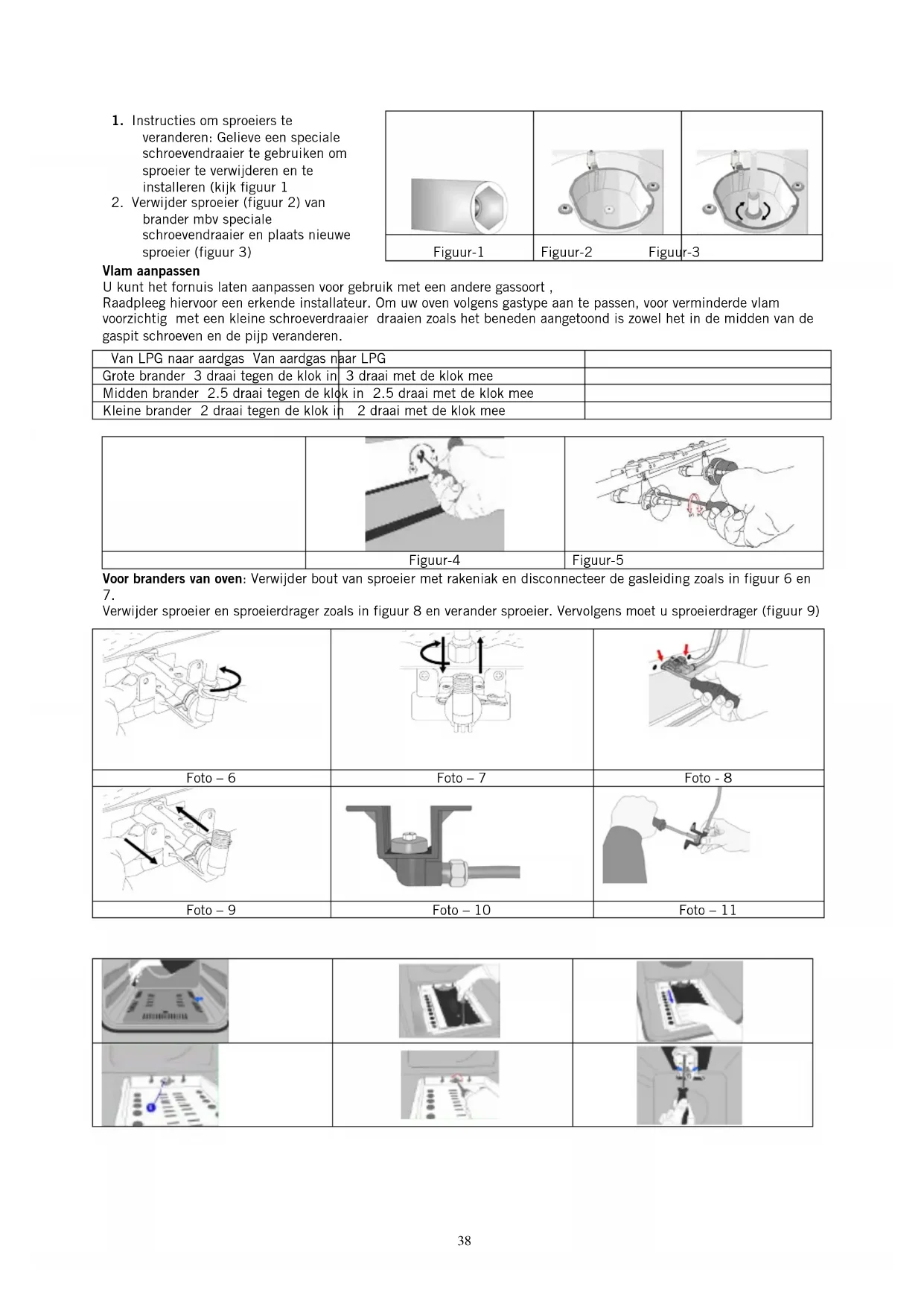 Voor branders van oven: Verwijder bout van spreier met rakeniak en disconnecteer de gasleiding zoals in figuur 6 en 7. Verwijder spreier en spreierdrager zoals in figuur 8 en verander spreier. Vervolgens moet u spreierdrager (figuur 9
