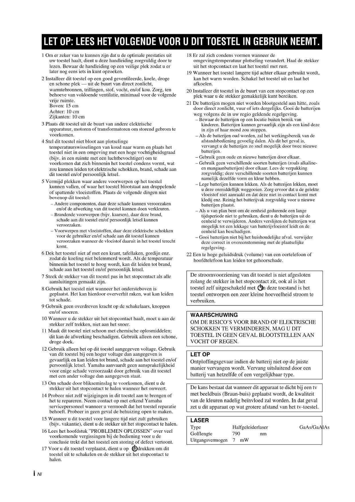 - VOCHT OF REGEN. LET OP Ontploffingsgevaar indien de batterij niet op de juiste manier vervangen wordt. Vervang uitsluitend door een batterij van hetzelfde of een vergelijkbaar type. De kans bestaat dat wanneer dit apparaat te dicht bij een tv met beeldbuis (Braun-buis) geplaatst wordt, de kwaliteit van de kleuren nadelig beïnvloed zal worden. In dat geval zet u dit apparaat op wat grotere afstand van het tv-toestel. LASER Type Halfgeleiderlaser GaAs/GaAlAs Golflengte 790 nm Uitgangsvermogen 7 mW1 Nl English Français Deutsch Svenska Italiano Español Nederlands Русский AANSLUITINGEN p. 2