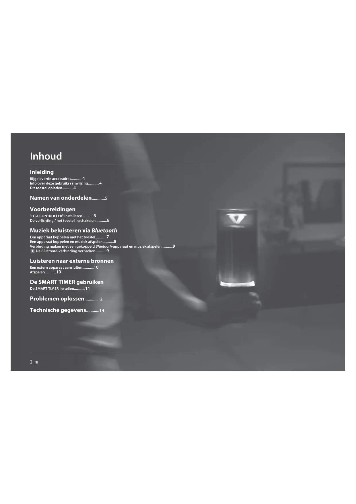 • Vergeet de SMART TIMER niet te synchroniseren met het toestel nadat u de SMART TIMER- instellingen geconfigureerd hebt. Inschakeltimer Uitschakeltimer• De verlichting op een opgegeven tijdstip inschakelen.• De helderheid van de verlichting opgeven.• Muziek op een aangesloten apparaat afspelen op een opgegeven tijdstip.• Een nummer opgeven.• Het volumeniveau vooraf instellen.• De verlichting op een opgegeven tijdstip uitschakelen.• Het toestel op een opgegeven tijdstip uitschakelen.Tengevolge van productverbeteringen kunnen specificaties en verschijning zonder kennisgeving worden gewijzigd.• Om een nummer op een ingesteld tijdstip af te spelen via een Bluetooth-verbinding, moet de Bluetooth-functie van uw smartphone of tablet ingeschakeld zijn. Zorg er in het geval van een iPhone voor dat u DTA CONTROLLER niet afsluit tijdens het multitasken.• Als er op het ingestelde tijdstip een ander Bluetooth-apparaat verbonden is met het toestel, zal het nummer dat u gekozen hebt voor de inschakeltimer niet afgespeeld worden. Verbreek de verbinding met eventuele andere apparaten vooraleer het ingestelde tijdstip aanbreekt.• De in- en uitschakeltimer van de SMART TIMER kunnen alleen via DTA CONTROLLER geactiveerd/gedeactiveerd worden.Interne klok van het toestel• Het toestel kopieert het tijdstip van DTA CONTROLLER naar zijn interne klok wanneer er een apparaat via Bluetooth verbonden wordt met het toestel. De SMART TIMER volgt de interne klok van het toestel.• Als u de wisselstroomadapter loskoppelt en de batterij volledig leegloopt, zal de klokinstelling gereset worden en wordt de SMART TIMER uitgeschakeld.12 Nl