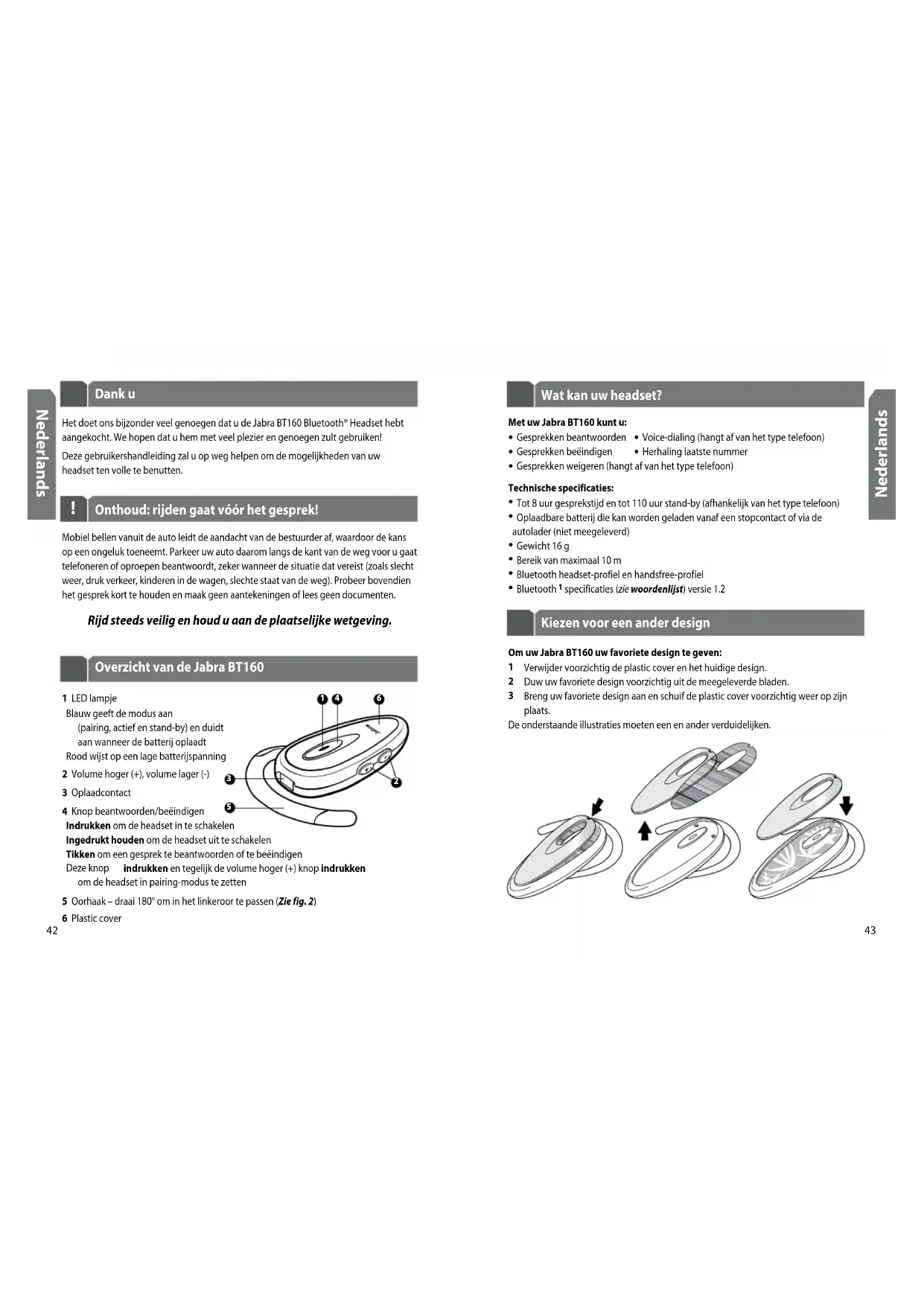 (pairing, actief en stand-by) en duidt aan wanneer de batterij oplaadt Rood wijst op een lage batterijspanning2 Volume hoger (+), volume lager (-)3 Oplaadcontact4 Knop beantwoorden/beëindigen Indrukken om de headset in te schakelen Ingedrukt houden om de headset uit te schakelen Tikken om een gesprek te beantwoorden of te beëindigen Deze knop indrukken en tegelijk de volume hoger (+) knop indrukken om de headset in pairing-modus te zetten5 Oorhaak – draai 180° om in het linkeroor te passen (Zie fig. 2)6 Plastic coverMet uw Jabra BT160 kunt u: • Gesprekken beantwoorden • Voice-dialing (hangt af van het type telefoon) • Gesprekken beëindigen • Herhaling laatste nummer • Gesprekken weigeren (hangt af van het type telefoon)Technische specificaties: • Tot 8 uur gesprekstijd en tot 110 uur stand-by (afhankelijk van het type telefoon) • Oplaadbare batterij die kan worden geladen vanaf een stopcontact of via de autolader (niet meegeleverd) • Gewicht 16 g • Bereik van maximaal 10 m • Bluetooth headset-profiel en handsfree-profiel • Bluetooth 1 specificaties (zie woordenlijst) versie 1.2 Wat kan uw headset?