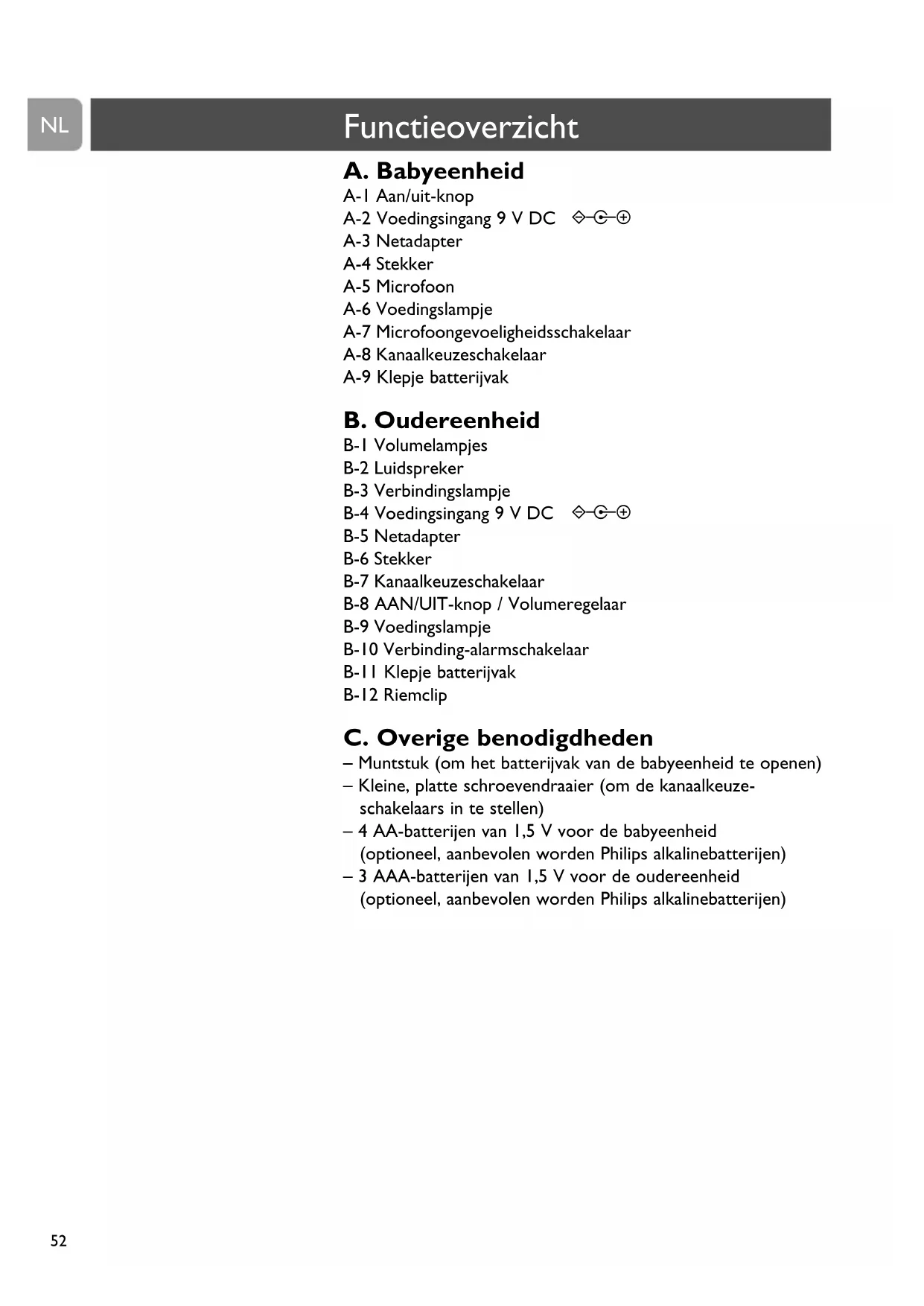 – 3 AAA-batterijen van 1,5 V voor de oudereenheid