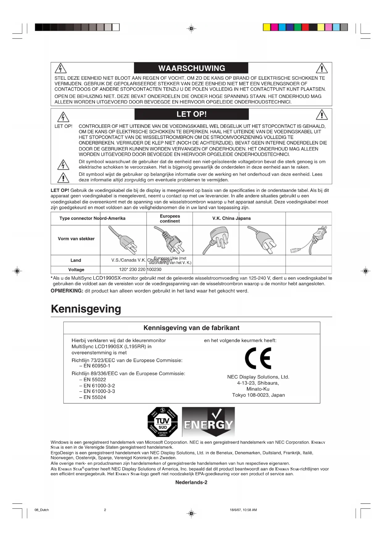 - Per pulire la carrozzeria, inumidire il panno con un detergente neutro e acqua, strofinare la carrozzeria e poi passare un panno asciutto. NOTA: La superficie della carrozzeria è ricoperta da diversi tipi di materie plastiche. Non pulire con benzene, diluente, detergente alcalino, detergente alcolico, detergente per vetri, cera, detergente per smalti, sapone in polvere o insetticidi. Evitare che gomme o sostanze viniliche vengano a contatto con la carrozzeria per molto tempo. Questi tipi di fluidi e tessuti possono provocare il deterioramento della vernice, screpolature o spelature. 07_Italian 18/6/07, 10:57 AM8Nederlands Nederlands-1 Index Waarschuwing, Let op!........................................................................................................... Nederlands-2 Kennisgeving ......................................................................................................................... Nederlands-2 Inhoud .................................................................................................................................... Nederlands-3 Snel aan de slag .................................................................................................................... Nederlands-4 Besturingselementen ............................................................................................................. Nederlands-6 Aanbevolen gebruik ............................................................................................................... Nederlands-7 08_Dutch 18/6/07, 10:58 AM1Nederlands-2 WAARSCHUWING LET OP! LET OP! CONTROLEER OF HET UITEINDE VAN DE VOEDINGSKABEL WEL DEGELIJK UIT HET STOPCONTACT IS GEHAALD, OM DE KANS OP ELEKTRISCHE SCHOKKEN TE BEPERKEN. HAAL HET UITEINDE VAN DE VOEDINGSKABEL UIT HET STOPCONTACT VAN DE WISSELSTROOMBRON OM DE STROOMVOORZIENING VOLLEDIG TE ONDERBREKEN. VERWIJDER DE KLEP NIET (NOCH DE ACHTERZIJDE). BEVAT GEEN INTERNE ONDERDELEN DIE DOOR DE GEBRUIKER KUNNEN WORDEN VERVANGEN OF ONDERHOUDEN. HET ONDERHOUD MAG ALLEEN WORDEN UITGEVOERD DOOR BEVOEGDE EN HIERVOOR OPGELEIDE ONDERHOUDSTECHNICI. Dit symbool waarschuwt de gebruiker dat de eenheid een niet-geïsoleerde voltagebron bevat die sterk genoeg is om elektrische schokken te veroorzaken. Het is bijgevolg gevaarlijk de onderdelen in deze eenheid aan te raken. Dit symbool wijst de gebruiker op belangrijke informatie over de werking en het onderhoud van deze eenheid. Lees deze informatie altijd zorgvuldig om eventuele problemen te vermijden. STEL DEZE EENHEID NIET BLOOT AAN REGEN OF VOCHT, OM ZO DE KANS OP BRAND OF ELEKTRISCHE SCHOKKEN TE VERMIJDEN. GEBRUIK DE GEPOLARISEERDE STEKKER VAN DEZE EENHEID NIET MET EEN VERLENGSNOER OF CONTACTDOOS OF ANDERE STOPCONTACTEN TENZIJ U DE POLEN VOLLEDIG IN HET CONTACTPUNT KUNT PLAATSEN. OPEN DE BEHUIZING NIET. DEZE BEVAT ONDERDELEN DIE ONDER HOGE SPANNING STAAN. HET ONDERHOUD MAG ALLEEN WORDEN UITGEVOERD DOOR BEVOEGDE EN HIERVOOR OPGELEIDE ONDERHOUDSTECHNICI. LET OP! Gebruik de voedingskabel die bij de display is meegeleverd op basis van de specificaties in de onderstaande tabel. Als bij dit apparaat geen voedingskabel is meegeleverd, neemt u contact op met uw leverancier. In alle andere situaties gebruikt u een voedingskabel die overeenkomt met de spanning van de wisselstroombron waarop u het apparaat aansluit. Deze voedingskabel moet zijn goedgekeurd en moet voldoen aan de veiligheidsnormen die in uw land van toepassing zijn. Type connector Noord-AmerikaEuropeescontinentV.K. China JapansVorm van stekker Land VoltageV.S./Canada V.K. China JapanEuropese Unie (metuitzondering van het V. K.)120* 230 220 100230 *Als u de MultiSync LCD1990SX-monitor gebruikt met de geleverde wisselstroomvoeding van 125-240 V, dient u een voedingskabel te gebruiken die voldoet aan de vereisten voor de voedingsspanning van de wisselstroombron waarop u de monitor hebt aangesloten. OPMERKING: dit product kan alleen worden gebruikt in het land waar het gekocht werd. Kennisgeving Kennisgeving van de fabrikant Hierbij verklaren wij dat de kleurenmonitor MultiSync LCD1990SX (L195RR) in overeenstemming is met Richtlijn 73/23/EEC van de Europese Commissie: – EN 60950-1 Richtlijn 89/336/EEC van de Europese Commissie: – EN 55022 – EN 61000-3-2 – EN 61000-3-3 – EN 55024 en het volgende keurmerk heeft: NEC Display Solutions, Ltd. 4-13-23, Shibaura, Minato-Ku Tokyo 108-0023, Japan Windows is een geregistreerd handelsmerk van Microsoft Corporation. NEC is een geregistreerd handelsmerk van NEC Corporation. ENERGY STAR is een in de Verenigde Staten geregistreerd handelsmerk. ErgoDesign is een geregistreerd handelsmerk van NEC Display Solutions, Ltd. in de Benelux, Denemarken, Duitsland, Frankrijk, Italië, Noorwegen, Oostenrijk, Spanje, Verenigd Koninkrijk en Zweden.Alle overige merk- en productnamen zijn handelsmerken of geregistreerde handelsmerken van hun respectieve eigenaren. Als ENERGY STAR