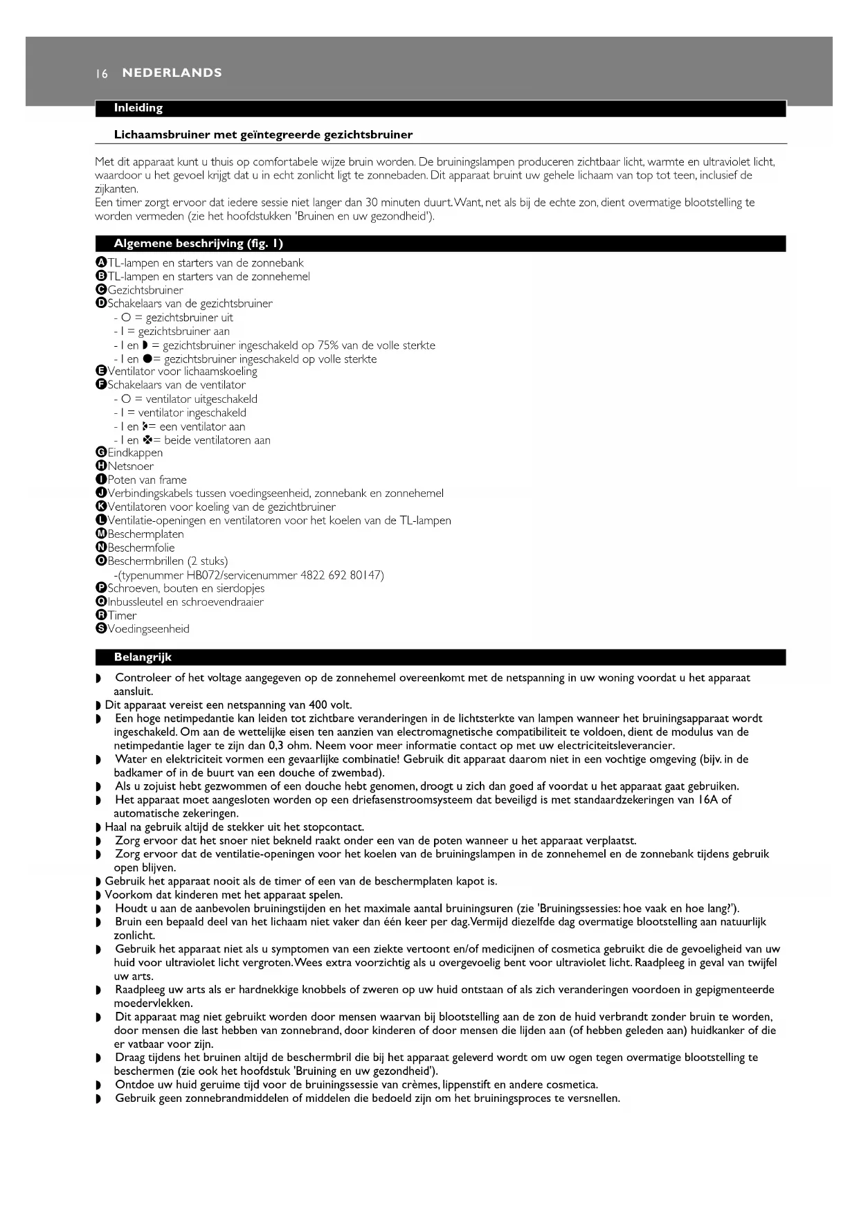 Met dit apparaat kunt u thuis op comfortabele wijze bruin worden. De bruiningslampen produceren zichtbaar licht, warmte en ultraviolet licht,