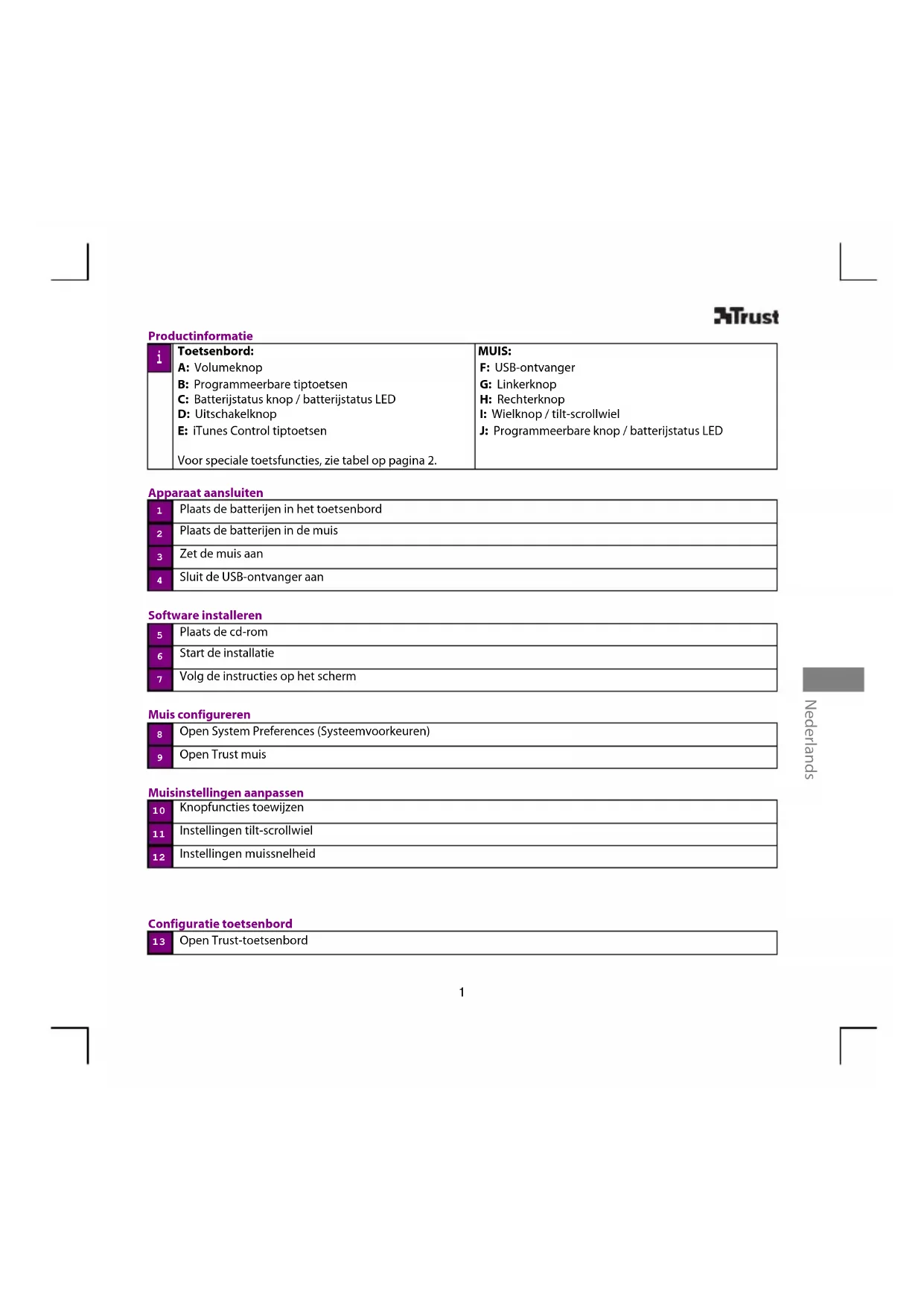 Productinformatie Toetsenbord: A: Volumeknop B: Programmeerbare tiptoetsen C: Batterijstatus knop / batterijstatus LED D: Uitschakelknop E: iTunes Control tiptoetsen Voor speciale toetsfuncties, zie tabel op pagina 2. MUIS: F: USB-ontvanger G: Linkerknop H: Rechterknop I: Wielknop / tilt-scrollwiel J: Programmeerbare knop / batterijstatus LED Apparaat aansluiten Plaats de batterijen in het toetsenbord Plaats de batterijen in de muis Zet de muis aan Sluit de USB-ontvanger aan Software installeren Plaats de cd-rom Start de installatie Volg de instructies op het scherm Muis configureren Open System Preferences (Systeemvoorkeuren) Open Trust muis Muisinstellingen aanpassen Knopfuncties toewijzen Instellingen tilt-scrollwiel Instellingen muissnelheid