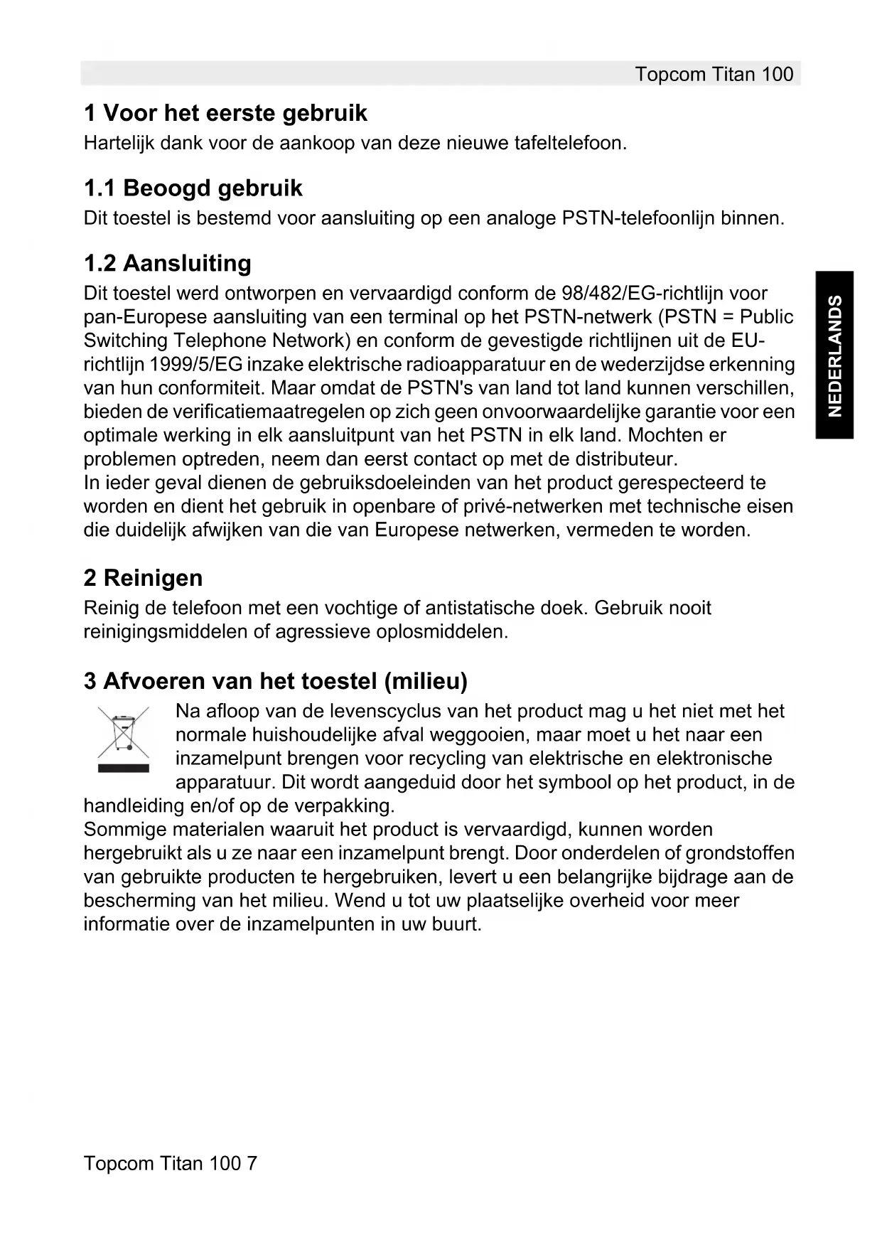 Dit toestel werd ontworpen en vervaardigd conform de 98/482/EG-richtlijn voor pan-Europese aansluiting van een terminal op het PSTN-netwerk (PSTN = Public Switching Telephone Network) en conform de gevestigde richtlijnen uit de EU- richtlijn 1999/5/EG inzake elektrische radioapparatuur en de wederzijdse erkenning van hun conformiteit. Maar omdat de PSTN's van land tot land kunnen verschillen, bieden de verificatiemaatregelen op zich geen onvoorwaardelijke garantie voor een optimale werking in elk aansluitpunt van het PSTN in elk land. Mochten er problemen optreden, neem dan eerst contact op met de distributeur. In ieder geval dienen de gebruiksdoeleinden van het product gerespecteerd te worden en dient het gebruik in openbare of privé-netwerken met technische eisen die duidelijk afwijken van die van Europese netwerken, vermeden te worden. 2 Reinigen Reinig de telefoon met een vochtige of antistatische doek. Gebruik nooit reinigingsmiddelen of agressieve oplosmiddelen. 3 Afvoeren van het toestel (milieu) Na afloop van de levenscyclus van het product mag u het niet met het normale huishoudelijke afval weggooien, maar moet u het naar een inzamelpunt brengen voor recycling van elektrische en elektronische apparatuur. Dit wordt aangeduid door het symbool op het product, in de handleiding en/of op de verpakking. Sommige materialen waaruit het product is vervaardigd, kunnen worden hergebruikt als u ze naar een inzamelpunt brengt. Door onderdelen of grondstoffen van gebruikte producten te hergebruiken, levert u een belangrijke bijdrage aan de bescherming van het milieu. Wend u tot uw plaatselijke overheid voor meer informatie over de inzamelpunten in uw buurt.8 Topcom Titan 100 Topcom Titan 100 4 Veiligheidsadvies
