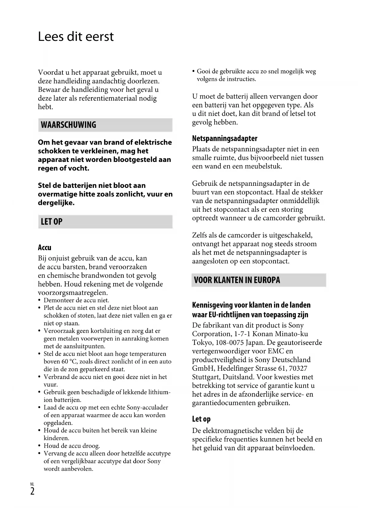voorzorgsmaatregelen. Demonteer de accu niet.Plet de accu niet en stel deze niet bloot aan schokken of stoten, laat deze niet vallen en ga er niet op staan.Veroorzaak geen kortsluiting en zorg dat er geen metalen voorwerpen in aanraking komen met de aansluitpunten.Stel de accu niet bloot aan hoge temperaturen boven 60 °C, zoals direct zonlicht of in een auto die in de zon geparkeerd staat.Verbrand de accu niet en gooi deze niet in het vuur.Gebruik geen beschadigde of lekkende lithium-ion batterijen.Laad de accu op met een echte Sony-acculader of een apparaat waarmee de accu kan worden opgeladen.Houd de accu buiten het bereik van kleine kinderen.Houd de accu droog.Vervang de accu alleen door hetzelfde accutype of een vergelijkbaar accutype dat door Sony wordt aanbevolen.